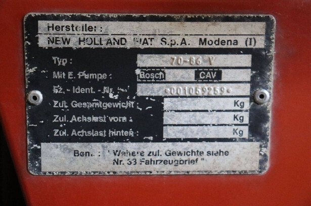 Brand: Fiat Type: 70-86V Serial number: 001059259 Year of construction: 1990 Fuel: Diesel Engine power: 51 kW Engine Brand: Iveco Operating hours read: 4515 h Tires: Pneumatic tires Color: red