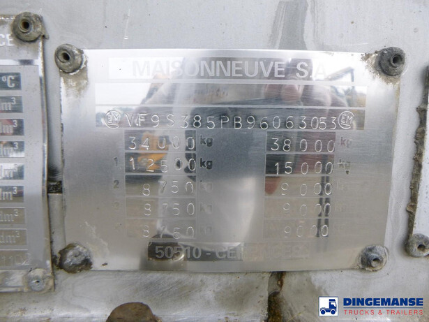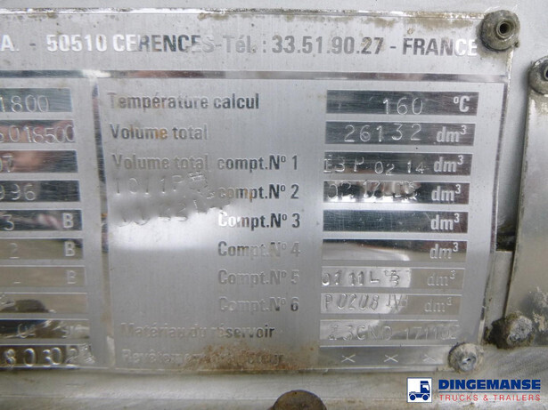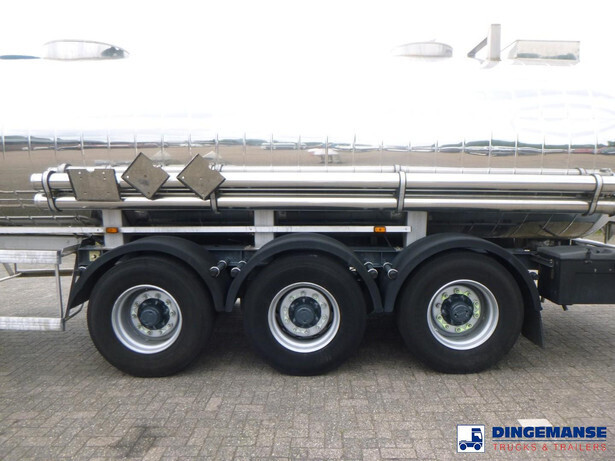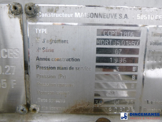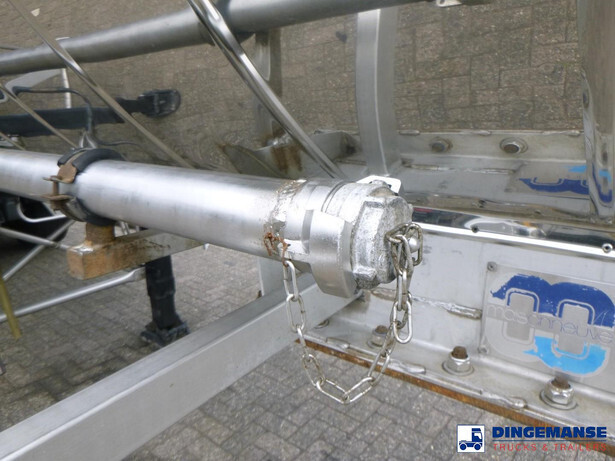 Chemical (acid) tank, Stainless steel (inox),Nominal capacity 22484 litres, 1 Compartment, Originally used for UN 1824 sodium hydroxide, ADR tank code L4BH+, Test pressure 4 bar, Max. working pressure 3 bar, Wall thickness 3 mm (shell), 5 mm (heads), Tank material code Z3CND17.11.02, ABS, Air suspension, SMB axles, Alloy wheels, Shipment dimensions 1100x250x340 cm