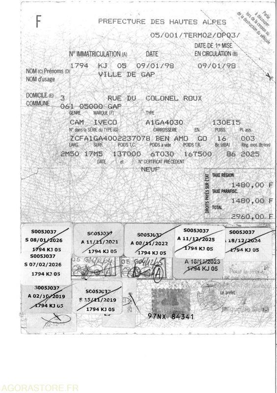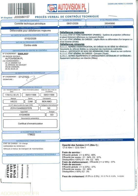 FR: Type de véhicule CAMION Date et lieu de visite: GAP Etat carrosserie: BON Etat intérieur: BON Etat des pneus: BON Climatisation: NON Version: 130E15 PV / PTAC / PTRA: 13T Etat moteur boite pont: BON Webasto: NON Dernier passage aux mines: 08/01/2026 Ad Blue: NON BARRE ANTI RAPPROCHEMENT BRAS DE LEVAGE 8T Camion ampliroll Iveco Eurocargo 130E15 Mise en circulation 09/01/1998 179.253 kms 13T Bras de levage Guima BG8 8T Empattement : 4.45m Barre anti rapprochement arrière CONTROLE TECHNIQUE EN CONTRE-VISITE : Rouille sur châssis et phare défectueux Le véhicule n'a plus de neiman. Contact et démarrage via des interrupteur ! VENDU EN L'ETAT