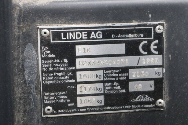 Brand: Linde Type: E16 Serial number: H2XX35K04071 Year of construction: 1999 Fuel: Electric Mast type: Duplex Sideshift: Yes Lifting capacity: 1600 kg Lifting height: 3500 mm Operating hours read: Not known Machine weight: 3324 kg Tires: Non-marking tires Color: orange