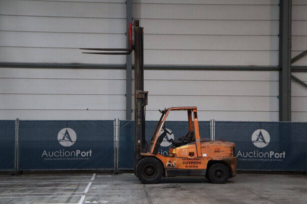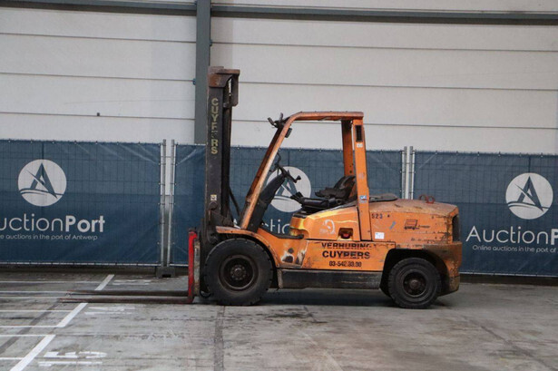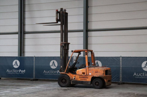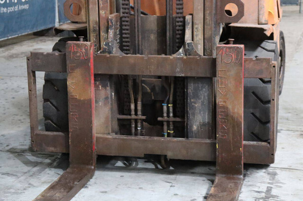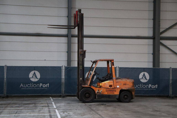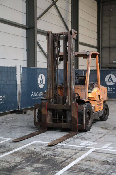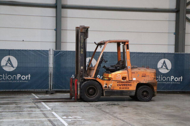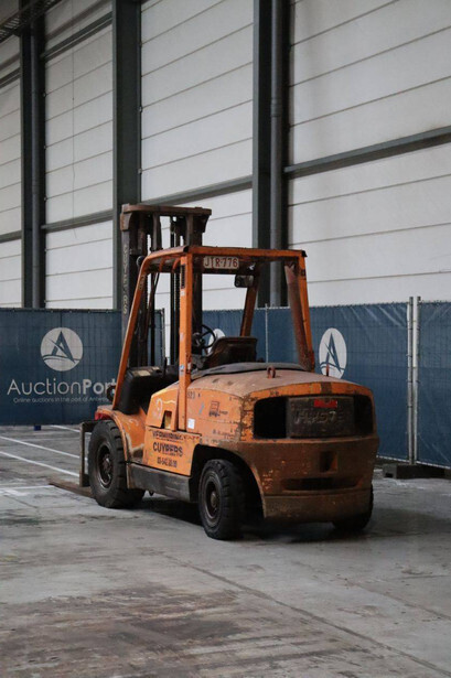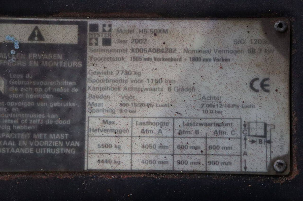 Brand: Hyster Type: H5.00XM Serial number: K005A00523Z Year of construction: 2002 Fuel: Diesel Mast type: Duplex Sideshift: No Lifting capacity: 5500 kg Lifting height: 4050 mm Recorded operating hours: 2397 h Machine weight: 7730 kg Tires: Solid tires Color: orange