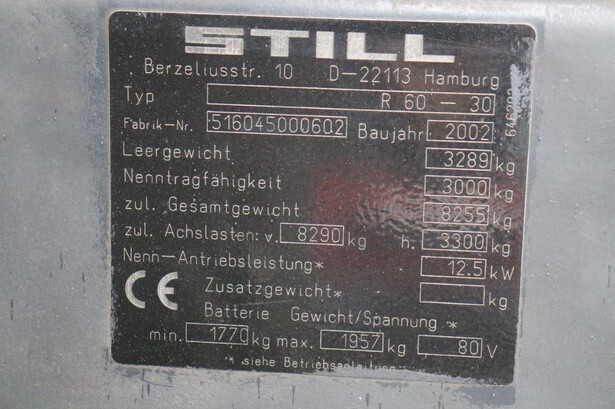 Brand: Still Type: R 60–30 Serial number: 516045000602 Year of construction: 2002 Fuel: Electric Mast type: Duplex Sideshift: No Lifting capacity: 3000 kg Reading operating hours: 8123 h Machine weight: 5069 kg Tires: Solid tires Color: orange