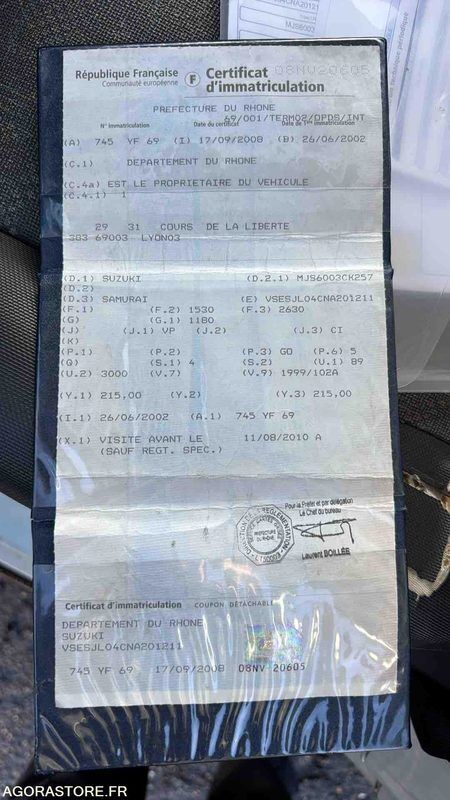 Suzuki SAMURAI Power: 64 Engine volume: 1870 Fuel: gas Axle configuration: 4x4 Gearbox type: manual FR: Type de véhicule TS TERRAINS/CHEMINS IMPORTANT: Voir rapport d'inspection en pièce jointe / RETRAIT A LA CHARGE DE L'ACHETEUR SANS AIDE DE LA COLLECTIVITE Nb portes: 3 Voir rapport d'inspection en pièce jointe répartiteur freinage défaillant Moteur tournant et véhicule roulant Ref No:411400 VIN: VSESJL04CNA201211