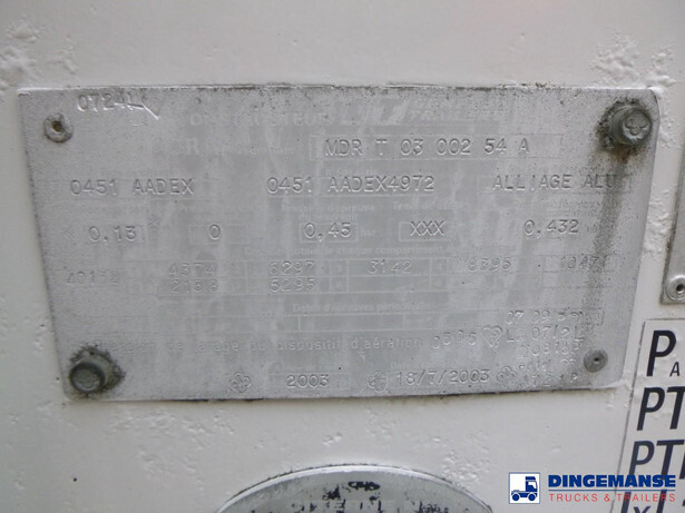 Aluminium fuel tank, Capacity 40107 liters, 7 Compartments 4372; 6298; 3141; 8387; 10457; 2158; 5294 liters, Year of construction 2003, Test pressu 0.45 bar, Max working pressure 0.13 bar, Vapour recovery, Overload sensor, Air suspension, Disc brakes, ABS, SMB axles, Shipment dimensions 1225x250x360 cm