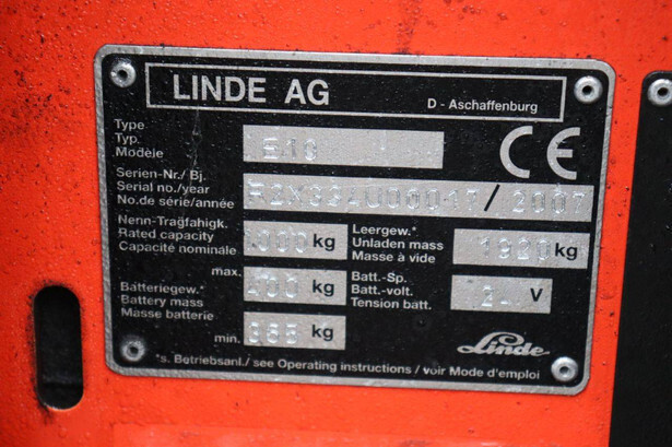 Brand: Linde Type: E10 Serial number: R2X334U00017 Year of construction: 2007 Fuel: Electric Mast type: Triplex Sideshift: Yes Lifting capacity: 1000 kg Operating hours read: 2906 h Machine weight: 2320 kg Color: red