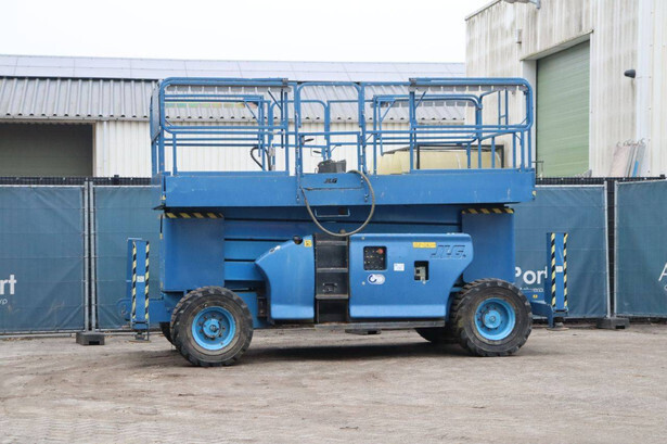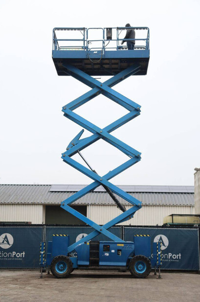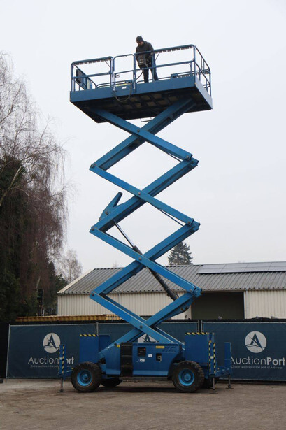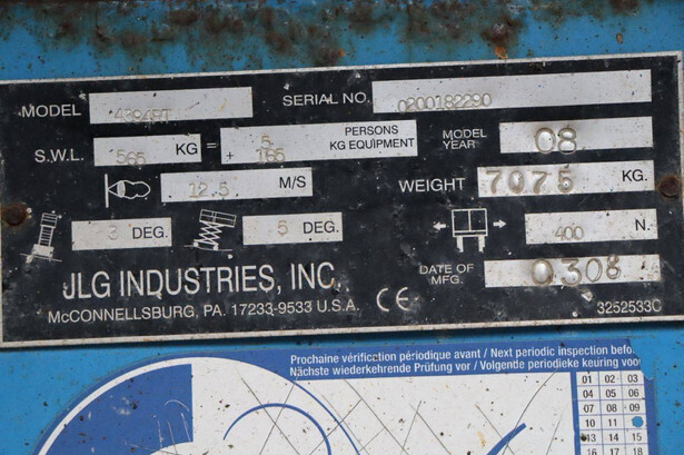 Brand: JLG Type: 4394RT Serial number: 0200182290 Year of construction: 2008 Fuel: Diesel Lifting capacity: 565 kg Working height: 15.11 m Operating hours read: 4318 h Machine weight: 7075 kg Chassis: Wheels Type: Scissor lift Tires: Pneumatic tires Color: blue