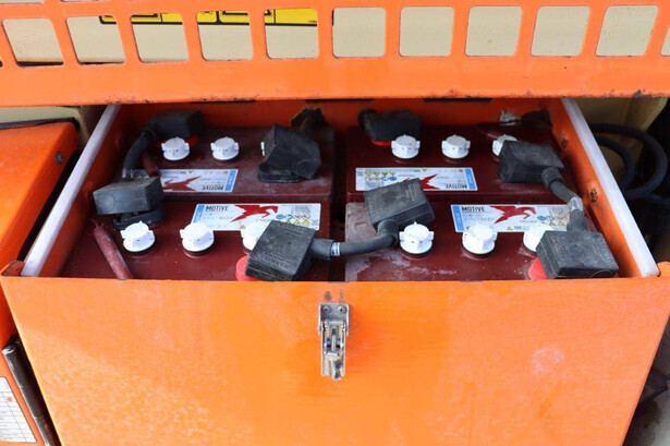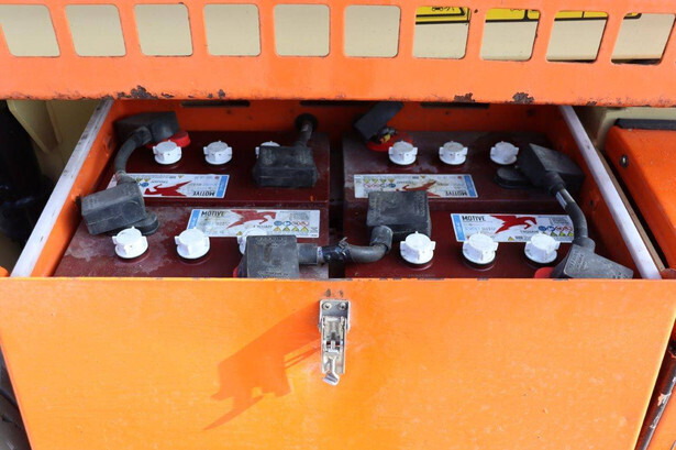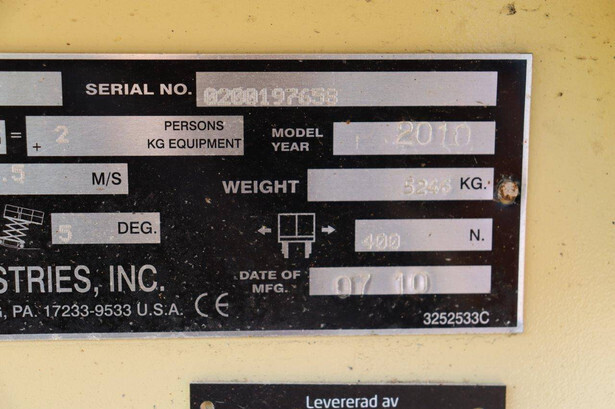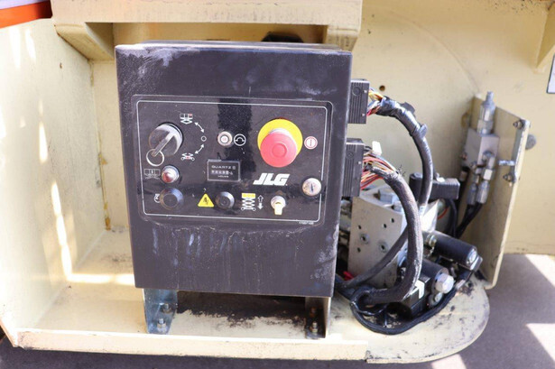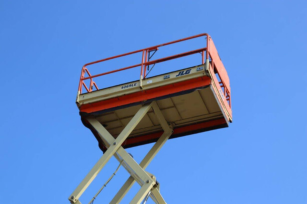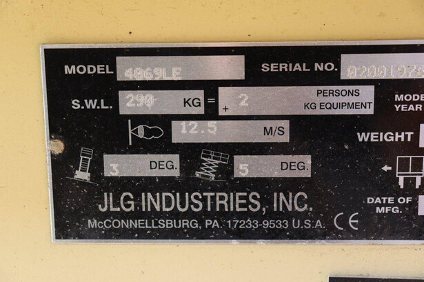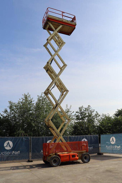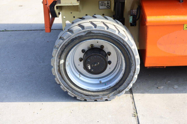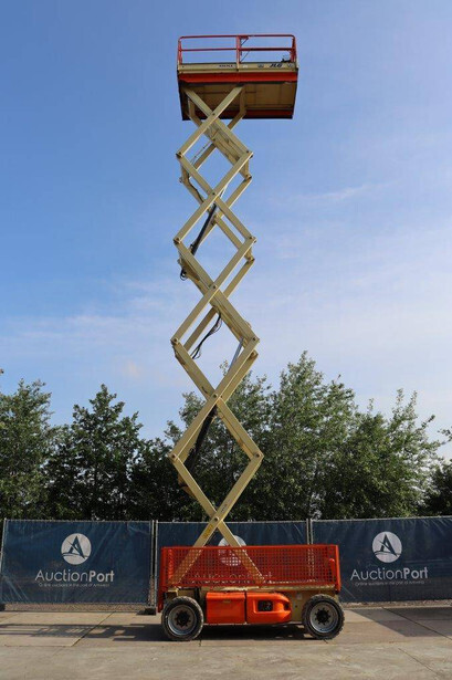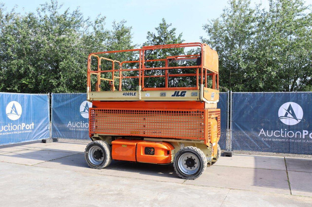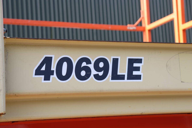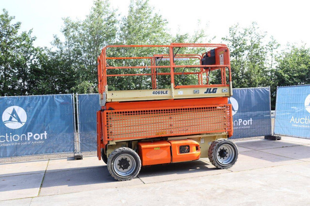 Brand: JLG Type: 4069LE Serial number: 0200197658 Year of construction: 2010 Fuel: Electric Lifting capacity: 290 kg Working height: 14.19 m Operating hours read: 449 h Machine weight: 5246 kg Chassis: Wheels Type: Scissor lift Tires: Solid rubber tires Color: orange