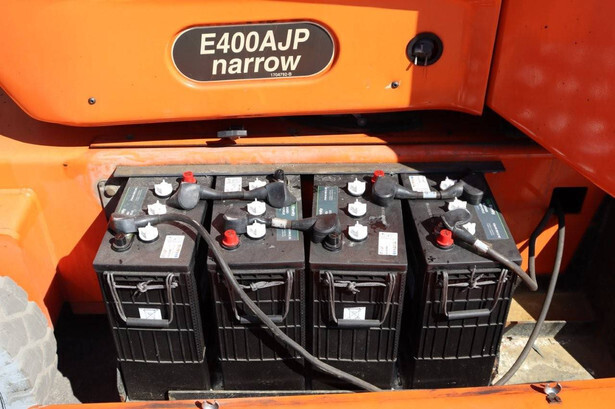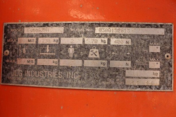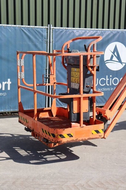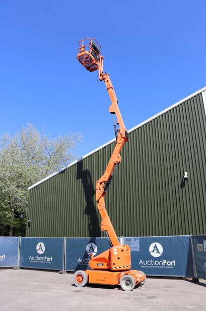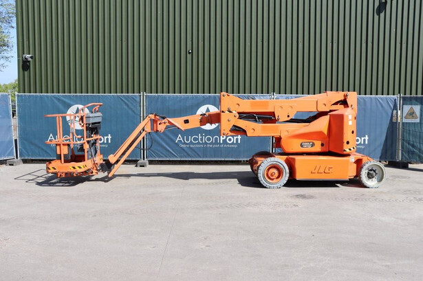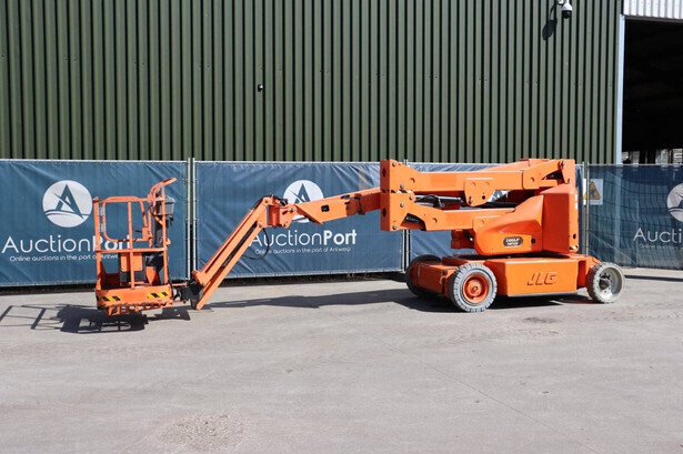 Brand: JLG Type: E400AJPN Serial number: 0300152813 Year of construction: 2011 Fuel: Electric Lifting capacity: 230 kg Working height: 14.19 m Operating hours read: 1079 h Machine weight: 6847 kg Chassis: Wheels Type: Articulated boom lift Tires: Non-marking tires Color: orange
