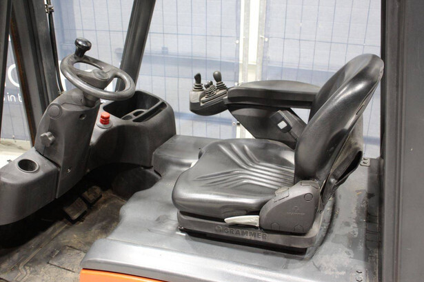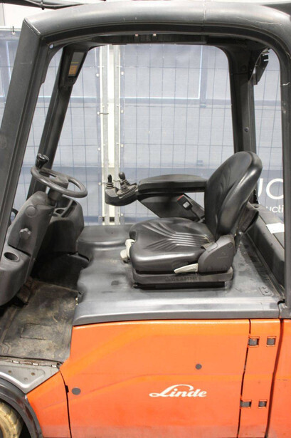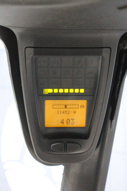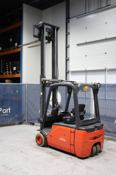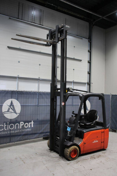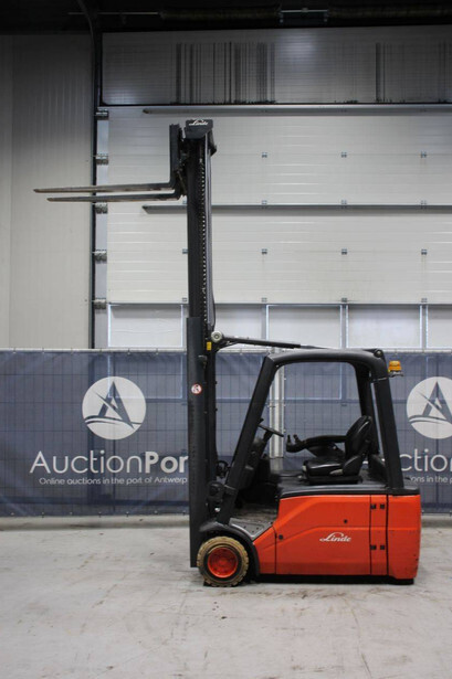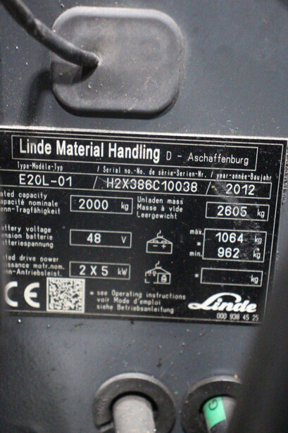Brand: Linde Type: E20L-01 Serial number: H2X386C10038 Year of construction: 2012 Fuel: Electric Mast type: Triplex Sideshift: Yes Lifting capacity: 2000 kg Lifting height: 3500 mm Operating hours read: 11452 h Machine weight: 3669 kg Tires: Non-marking tires Color: orange