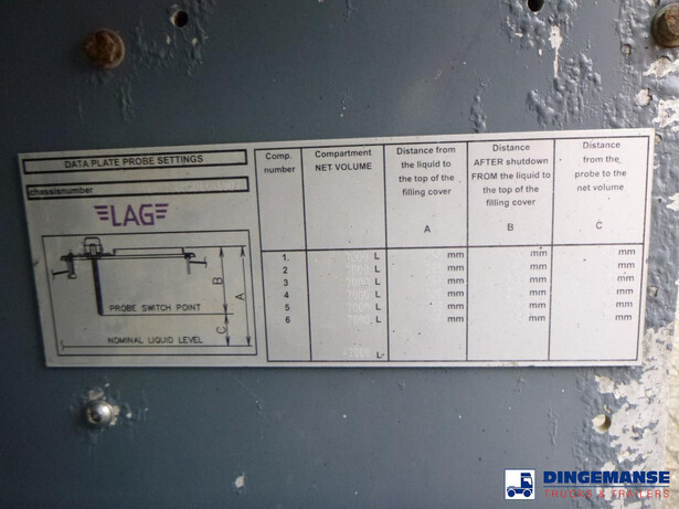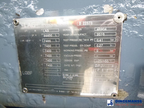 NON DUTY FREE VEHICLE, REQUIRES CUSTOMS CLEARANCE // aluminium fuel tank, Capacity 44400 liters, 6 Compartments (7400;7400;7400;7400;7400;7400), Year of construction 2013, Tank material code 5186/5182 EN14286, Test pressure 0.41 bar, Max working pressure 0 bar, Blackmer hydraulic pump type TXH3C, Digital counter, Ticket printer, Vapour revovery, Overload sensor, Air suspension, BPW Eco Plus axles, ABS, Alloy wheels, Drum brakes, Shipment dimensions 1270x250x360 cm