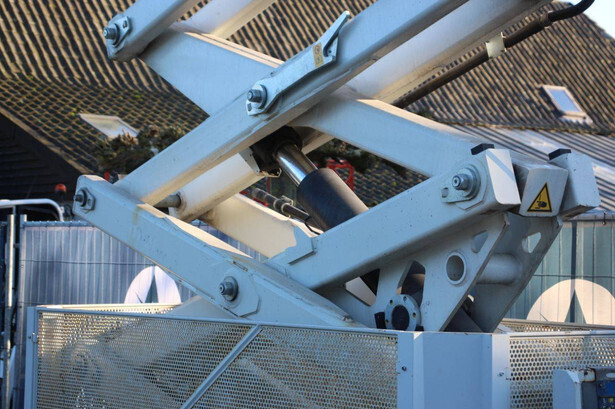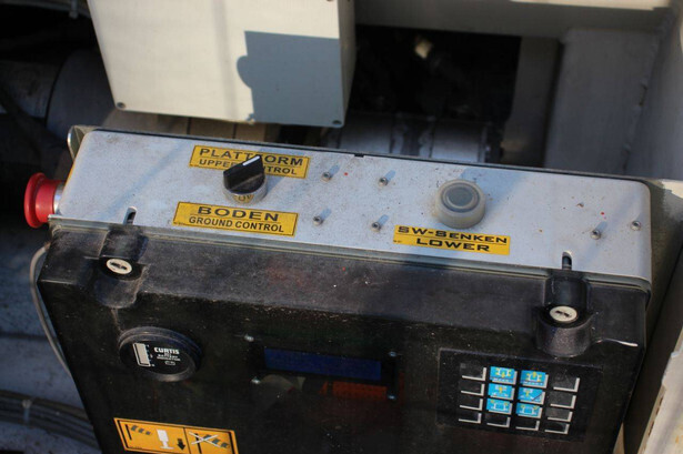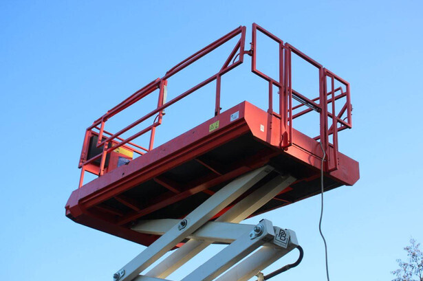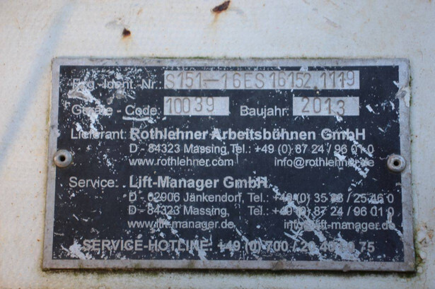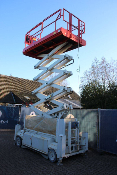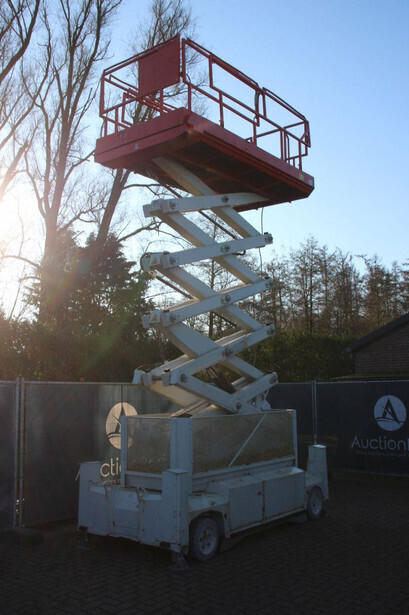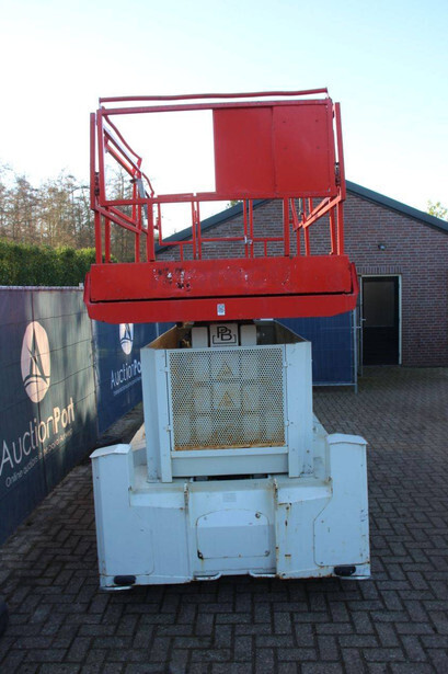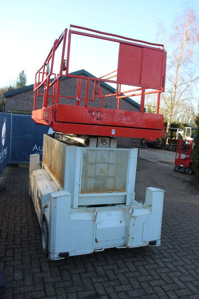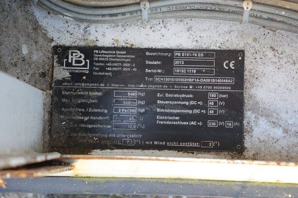 Brand: PB Type: PB S151-16 ES Serial number: 16152.1119 Year of construction: 2013 Fuel: Electric Lifting capacity: 550 kg Working height: 15.3 m Machine weight: 5480 kg Undercarriage: Wheels Type: Scissor lift Tires: Solid tires Color: red