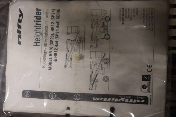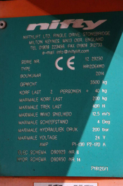 Brand: Niftylift Type: HR12DE Serial number: 12 29250 Year of construction: 2014 Fuel: Diesel Lifting capacity: 200 kg Working height: 12.2 m Operating hours read: Not known Machine weight: 3500 kg Chassis: Wheels Type: Articulated boom lift Tires: Non-marking tires Color: orange