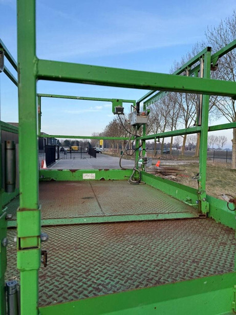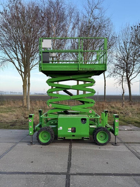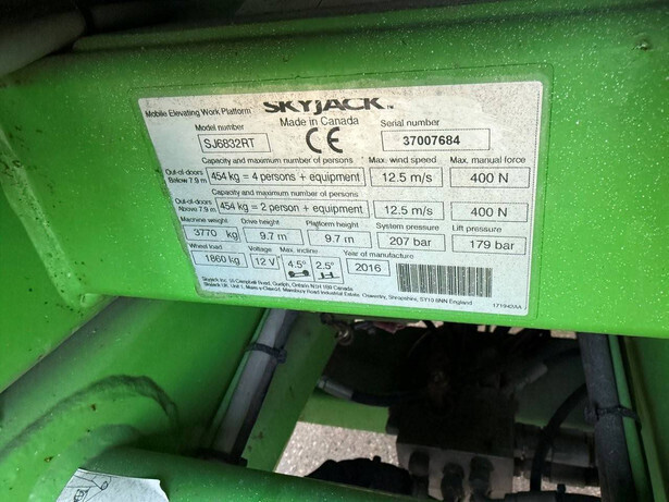 Brand: Skyjack Type: SJ6832RT Serial number: 37007684 Year of construction: 2016 Fuel: Diesel Lifting capacity: 454 kg Working height: 11.7 m Reading operating hours: 1144 h Machine weight: 3770 kg Chassis: Wheels Type: Scissor lift Tires: Pneumatic tires Color: green