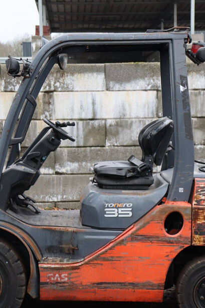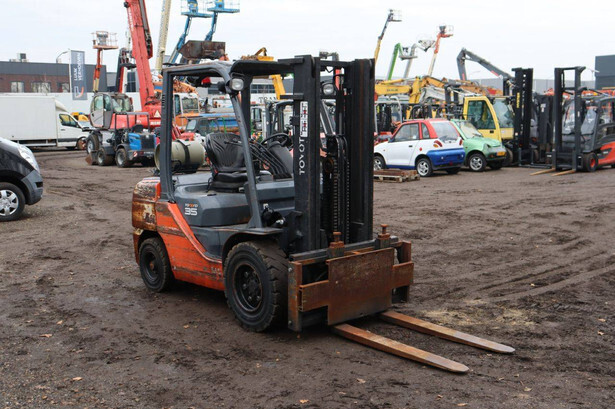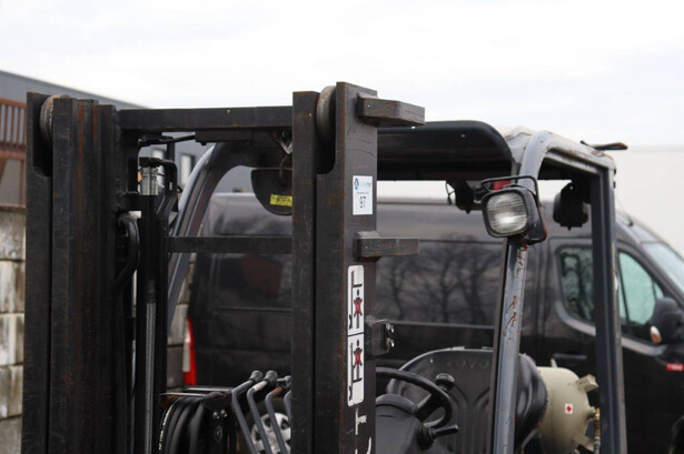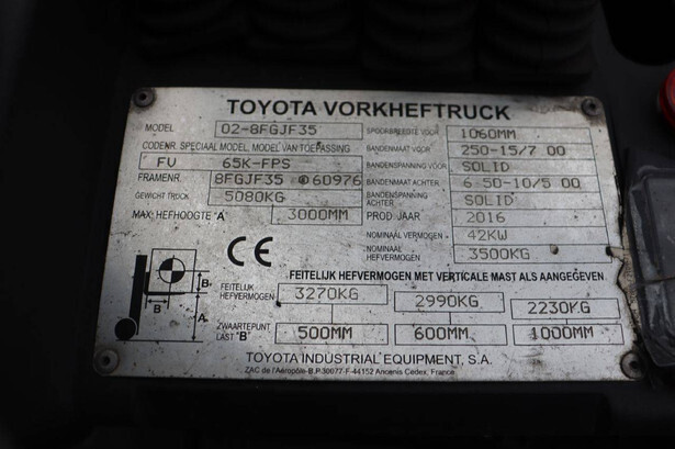 Brand: Toyota Type: 02-8FGJF35 Serial number: 8FGJF35-60976 Year of construction: 2016 Fuel: LPG Mast type: Duplex Sideshift: Yes Lifting capacity: 3500 kg Lifting height: 3000 mm Operating hours read: Not known Machine weight: 5080 kg Tires: Solid tires Color: orange
