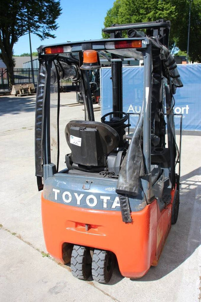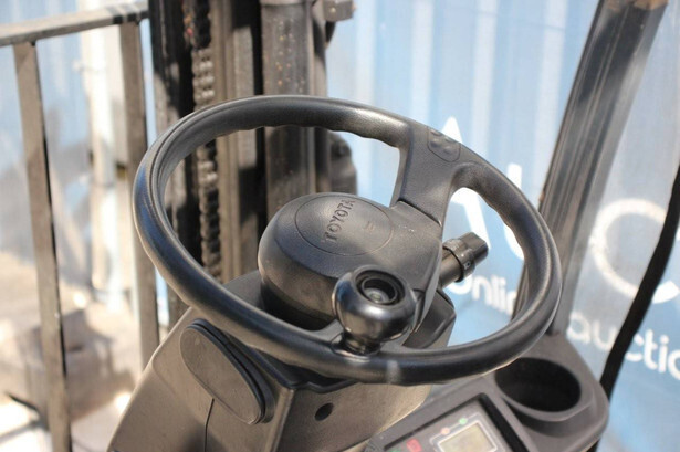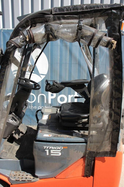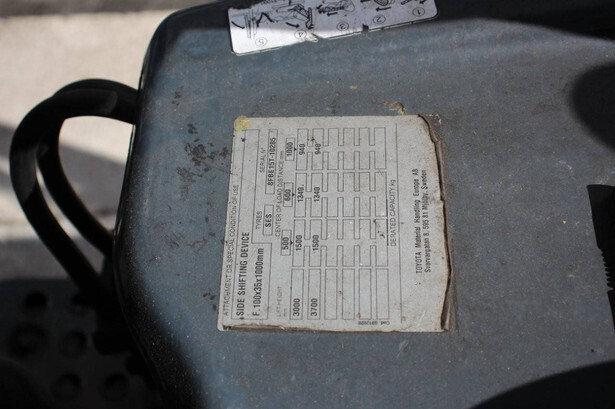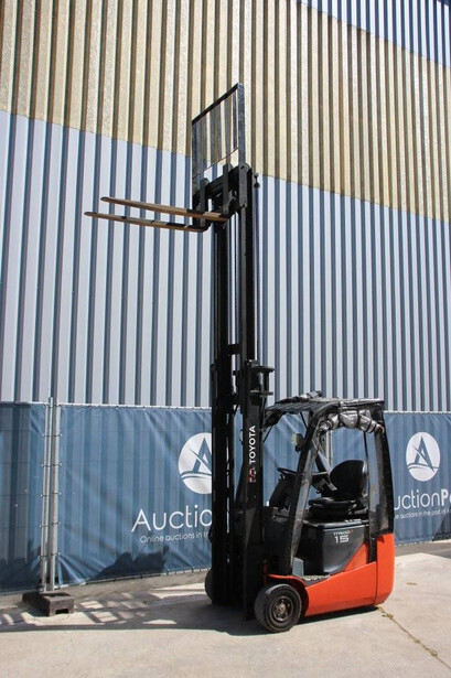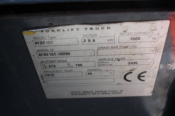 Brand: Toyota Type: 8FBE15T Serial number: 8FBE15T-10285 Year of construction: 2016 Fuel: Electric Mast type: Duplex Sideshift: Yes Lifting capacity: 1500 kg Lifting height: 3700 mm Operating hours read: 28697 h Machine weight: 3225 kg Tires: Solid tires Color: orange