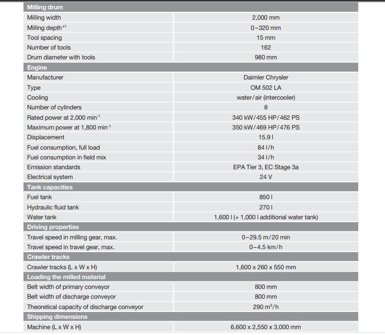 Wirtgen W2000 Weight: 277000 Engine make: Caterpillar Cylinder count: 8 Overall height: 3 Overall length: 6.6 Overall width: 2.55 EN: we have one unit Used wirtgen cold milling machine W2000 with 2017 year with 2 meter working width on sale More details pls check the pictures above Good condition & Get ready to work - [ ] contact person :Bonnie Yan - [ ] Email:[email protected] - [ ] Mobile/wechat/what's up/Viber:008618657287283 Ref No:YJ23505