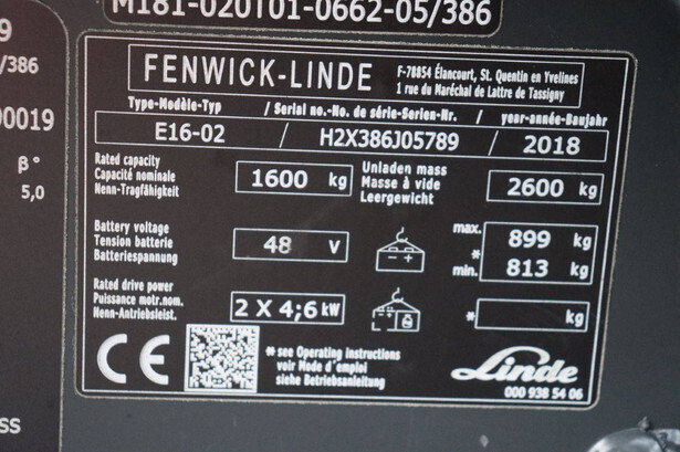 Brand: Linde Type: E16-02 Serial number: H2X386J05789 Year of construction: 2018 Fuel: Electric Mast type: Triplex Sideshift: Yes Lifting capacity: 1600 kg Operating hours read: 4243 h Machine weight: 3499 kg Tires: Solid tires Color: red