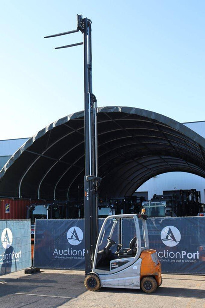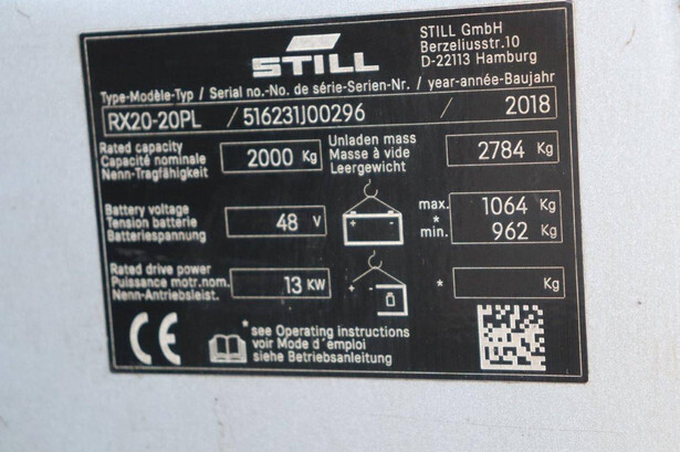 Brand: Still Type: RX20-20PL Serial number: 516231J00296 Year of construction: 2018 Fuel: Electric Mast type: Triplex Sideshift: Yes Lifting capacity: 2000 kg Lifting height: 7930 mm Reading operating hours: 19109 h Machine weight: 3900 kg Tires: Non-marking tires Color: gray