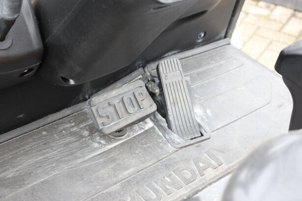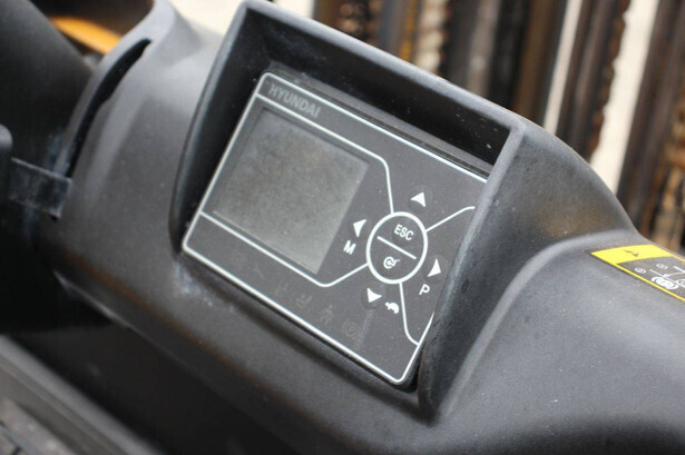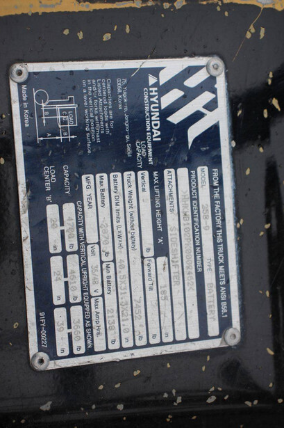 Brand: Hyundai Type: 25B-9 Serial number: HHKB102PK0002462 Year of construction: Not known Fuel: Electric Mast type: Plywood Sideshift: Yes Lifting capacity: 2150 kg Lifting height: 4700 mm Operating hours recorded: 7000 h Tires: Solid tires Color: yellow