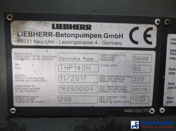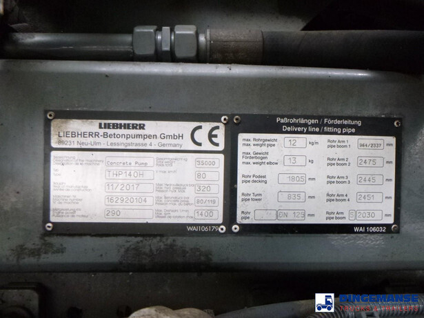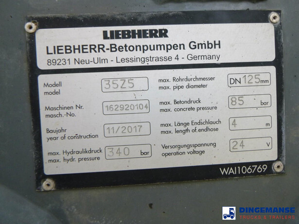 NON DUTY FREE VEHICLE, REQUIRES CUSTOMS CLEARANCE // Liebherr concrete pump type 35Z5, Year of construction 2017, Pipe diameter 12,5 cm, Max hydraulic pressure 340 bar, Max concrete pressure 85 bar, 4 support legs, radio controll, 35 XXT concrete boom, Max horizontal reach 30,7 meters, Max vertical reach 34,7 meters, End hose lenght 4 meters // Truck 8x4, Euro 6, Adblue, Automatic gearbox, Diff lock, Full steel suspension, Day cabin, Air conditioning, Digital tachograph, Shipment dimensions 1030x255x380 cm