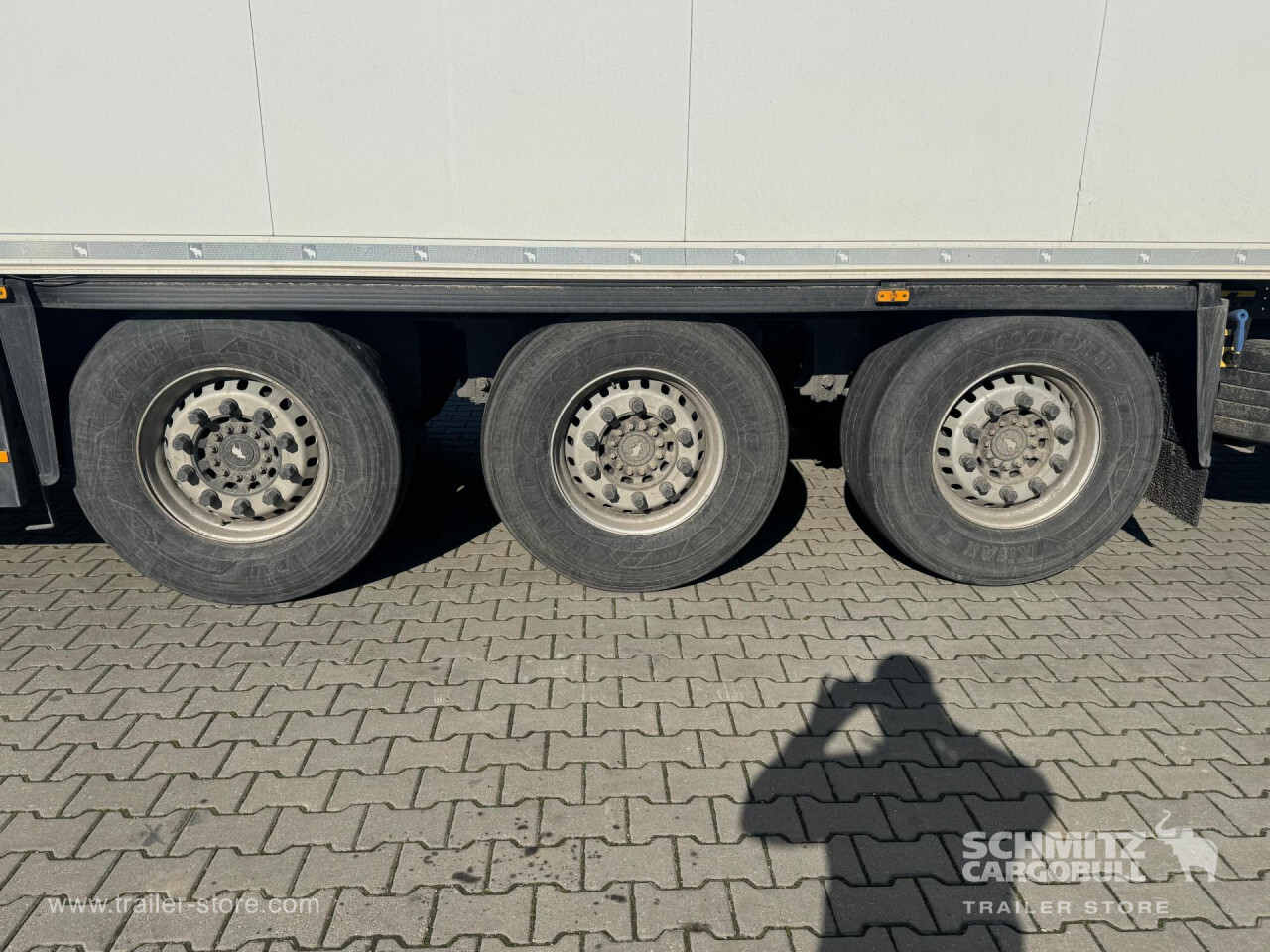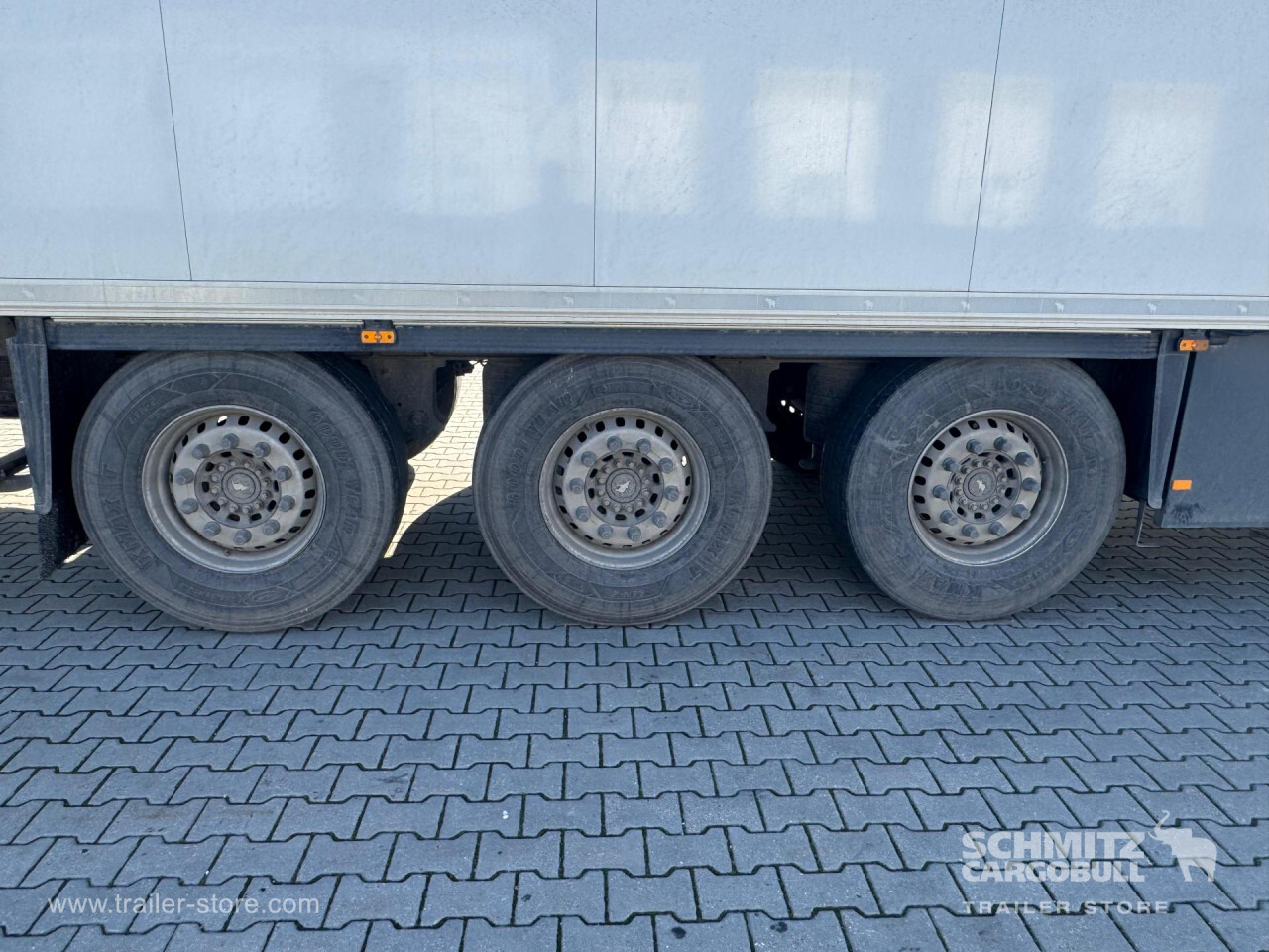 Remarks: **Safety**\\Rear underrun, Antilock Braking System ABS\\\\**Exterior**\\Air suspension, Pallet box (double), 1x15 and 2x7 pin plug, Antispray\\\\**Cargo securing**\\DIN EN 12642 (code XL) certificate, Pharma certificate\\\\**Brake system**\\Disc brake, Schmitz Cargobull\\\\**Floor**\\Aluminum floor\\\\**Cooling unit**\\Thermoking SLX Spectrum, 10.921 Operating hours Diesel, 75 Operating hours electric\\\\**Loading area**\\Length 13.403 mm, Width 2.490 mm, Height 2.650 mm, Volume 88 m³\\\\**Tyre sizes**\\1. Achse: 385/65 R22.5 , Tread depth: 10 mm / 8.5 mm, 2. Achse: 385/65 R22.5 , Tread depth: 9 mm / 9 mm, 3. Achse: 385/65 R22.5 , Tread depth: 10 mm / 9.8 mm\\\\**Other dimensions and weights**\\Wheel base: 7.600 mm\\\\----