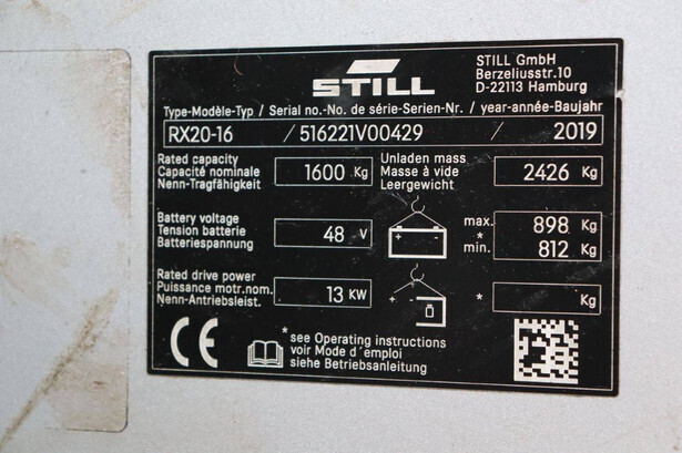 Brand: Still Type: RX20-16 Serial number: 516221V00429 Year of construction: 2019 Fuel: Electric Mast type: Triplex Sideshift: Yes Lifting capacity: 1600 kg Lifting height: 5620 mm Reading operating hours: 12357 h Machine weight: 3324 kg Tires: Solid tires Color: yellow