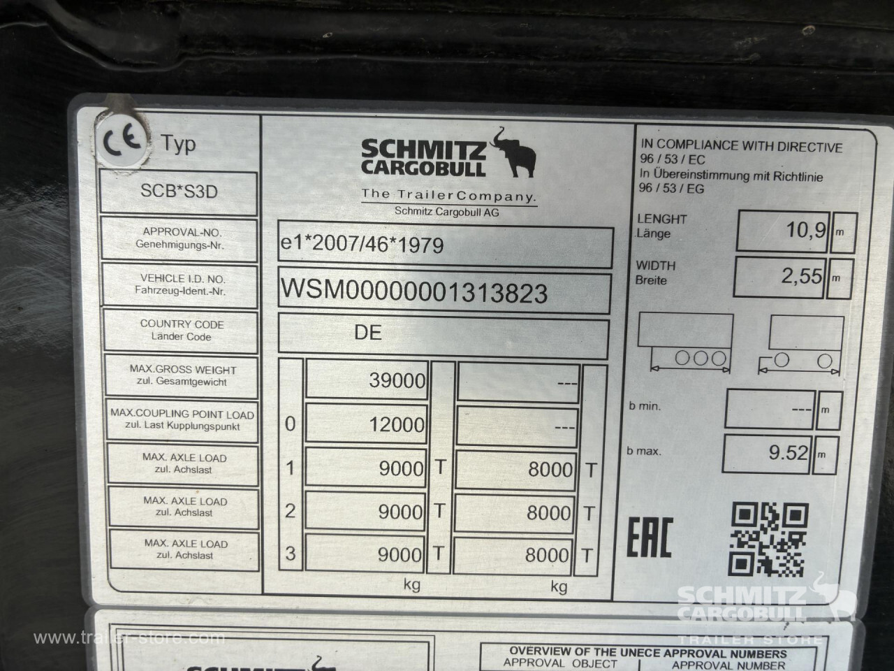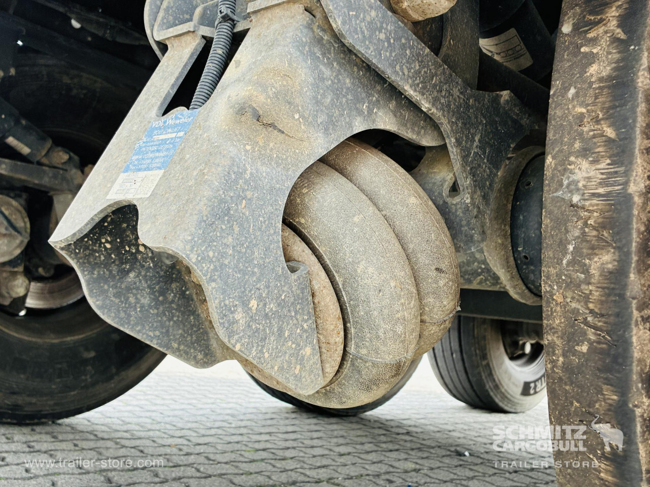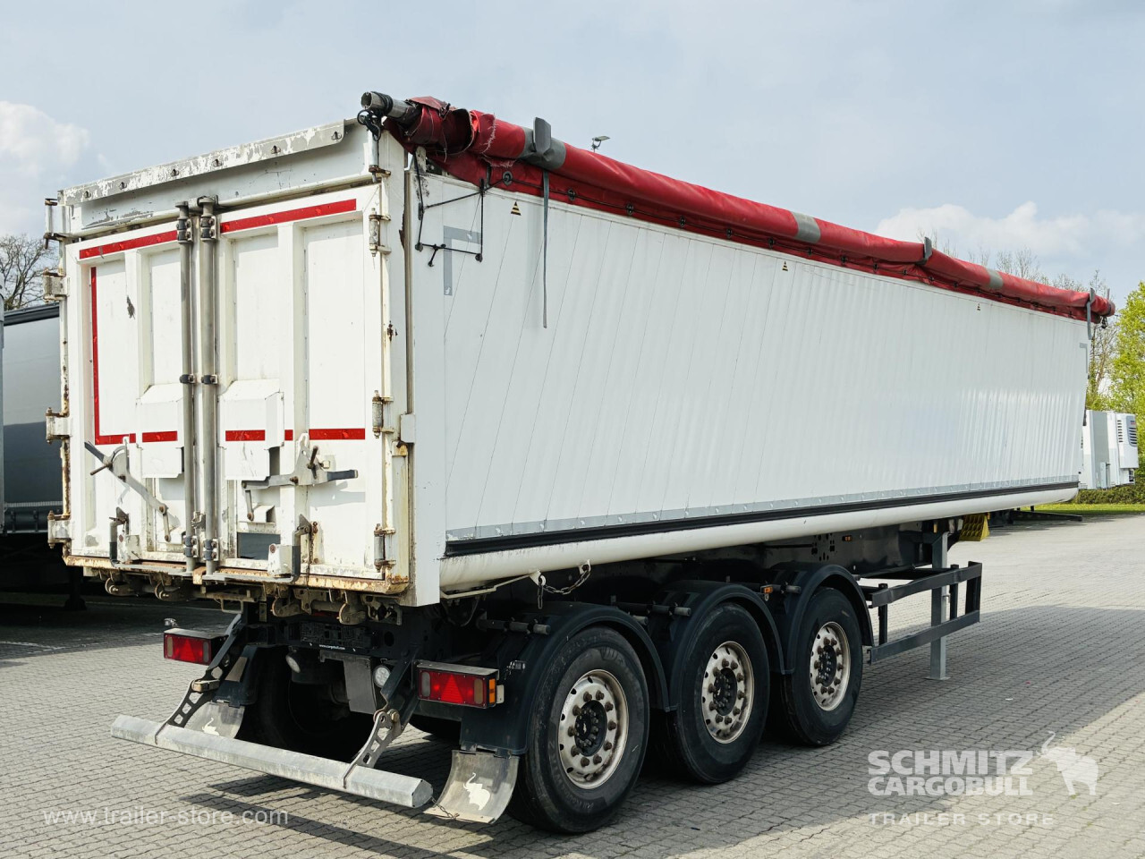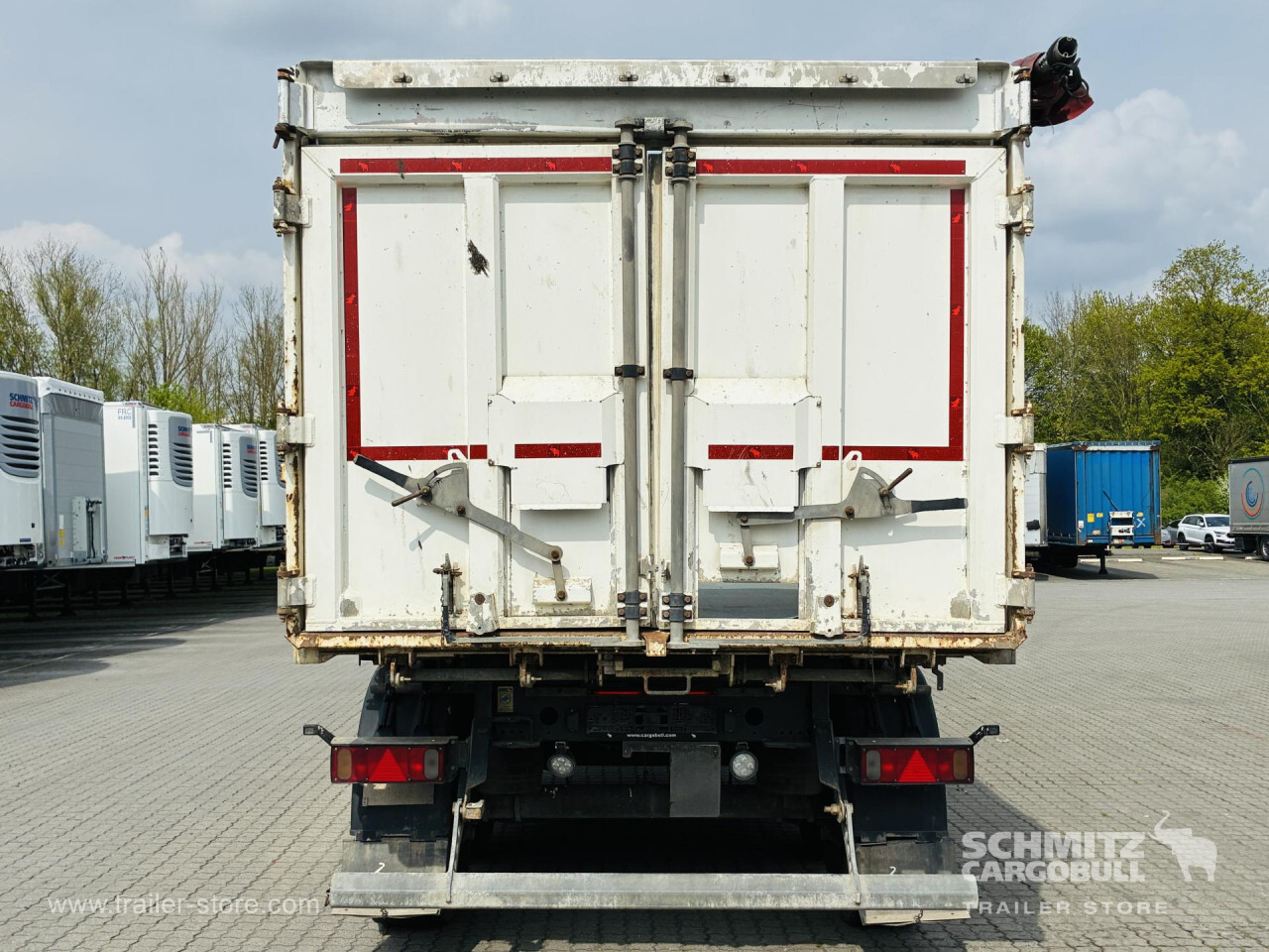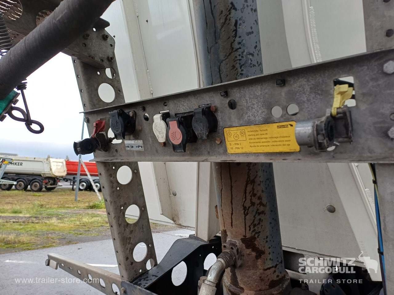 Remarks: **Safety**\\Hinged rear underrun, Antilock Braking System ABS\\\\**Exterior**\\Air suspension, Lift axle front, Grain chute, Roof rolling tarpaulin, Access platform, 1x15 and 2x7 pin plug, Antispray, Light alloy rims\\\\**Brake system**\\Disc brake, Schmitz ROTOS\\\\**Loading area**\\Length 9.750 mm, Width 2.440 mm, Height 1.900 mm, Volume 44 m³\\\\**Tyre sizes**\\1. Achse: 385/65 R22.5 , Tread depth: 12 mm / 12 mm, 2. Achse: 385/65 R22.5 , Tread depth: 13 mm / 13 mm, 3. Achse: 385/65 R22.5 , Tread depth: 11 mm / 14 mm\\\\**Other dimensions and weights**\\GVW: 36.000 kg\\\\----