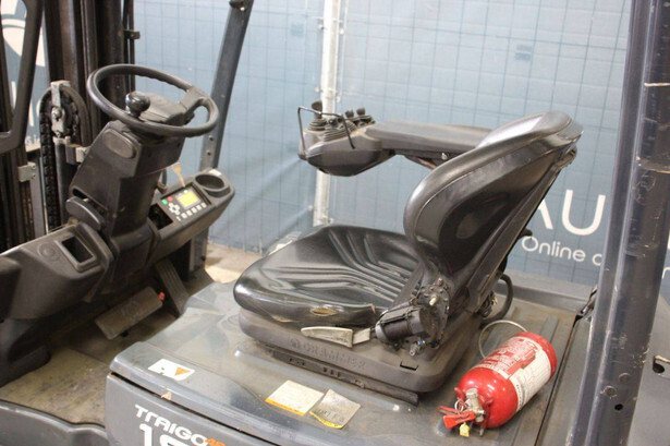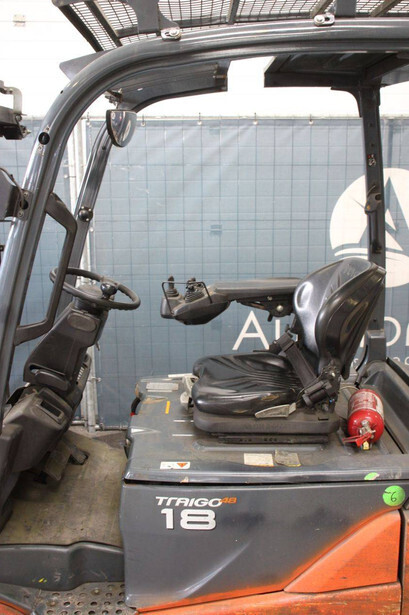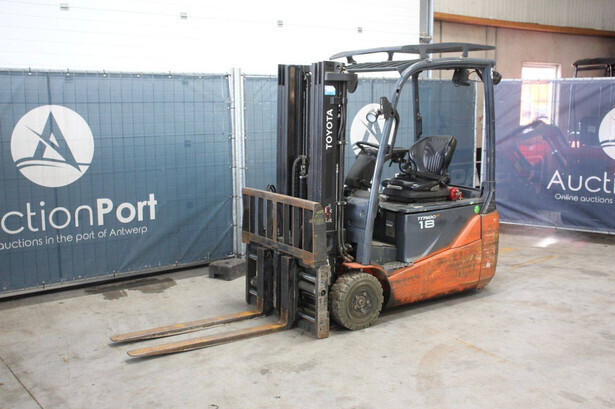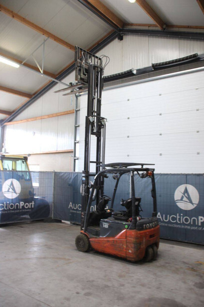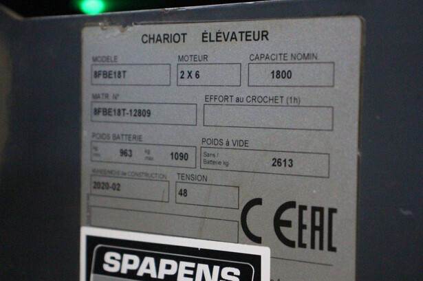 Brand: Toyota Type: 8FBE18T Serial number: 8FBE18T-12809 Year of construction: 2020 Fuel: Electric Mast type: Plywood Sideshift: Yes Lifting capacity: 1800 kg Lifting height: 4300 mm Recorded operating hours: 14,955 hours Tires: Non-marking tires Color: orange