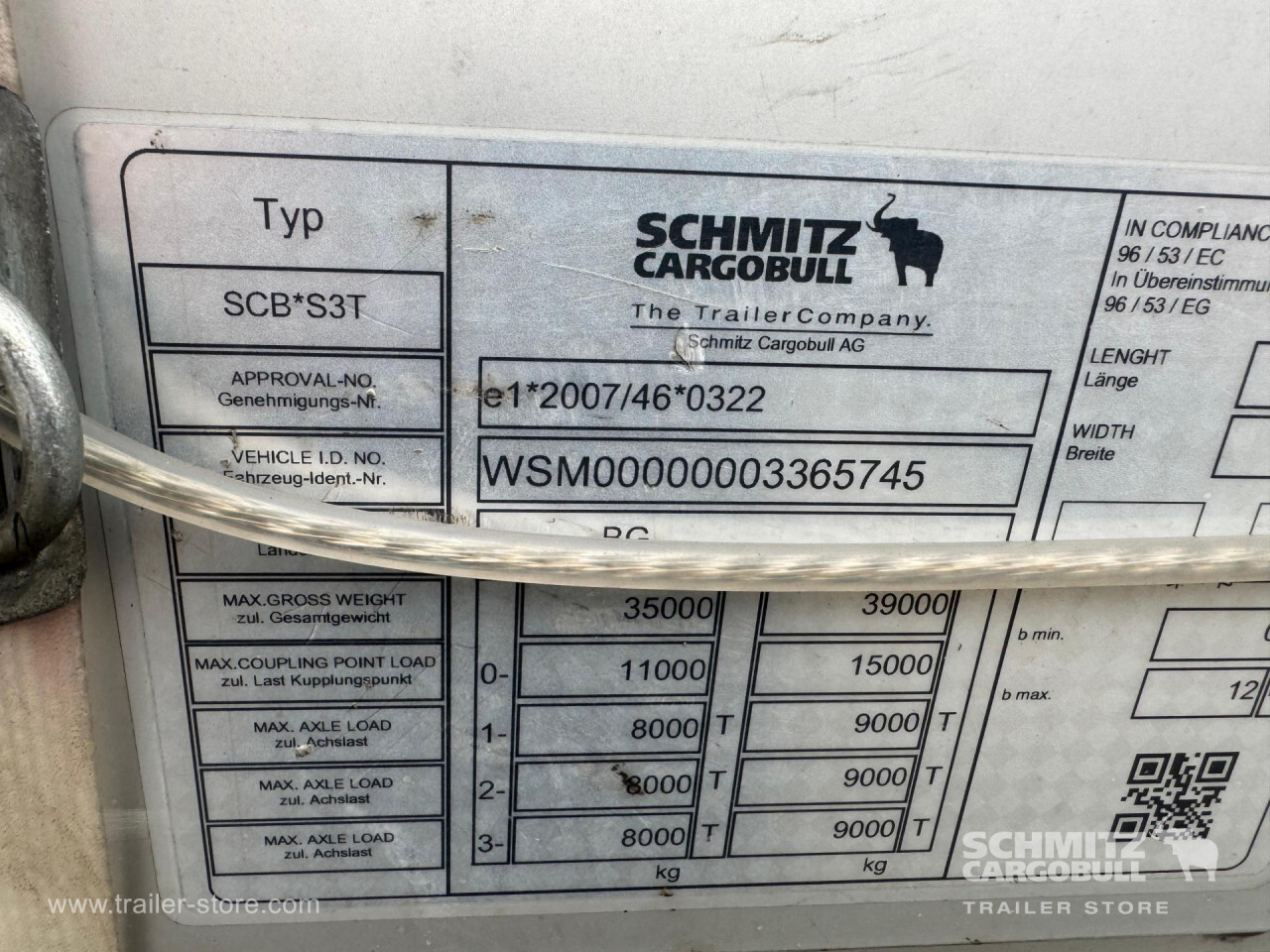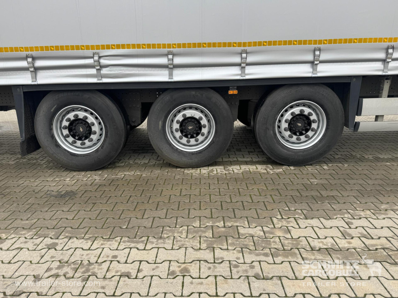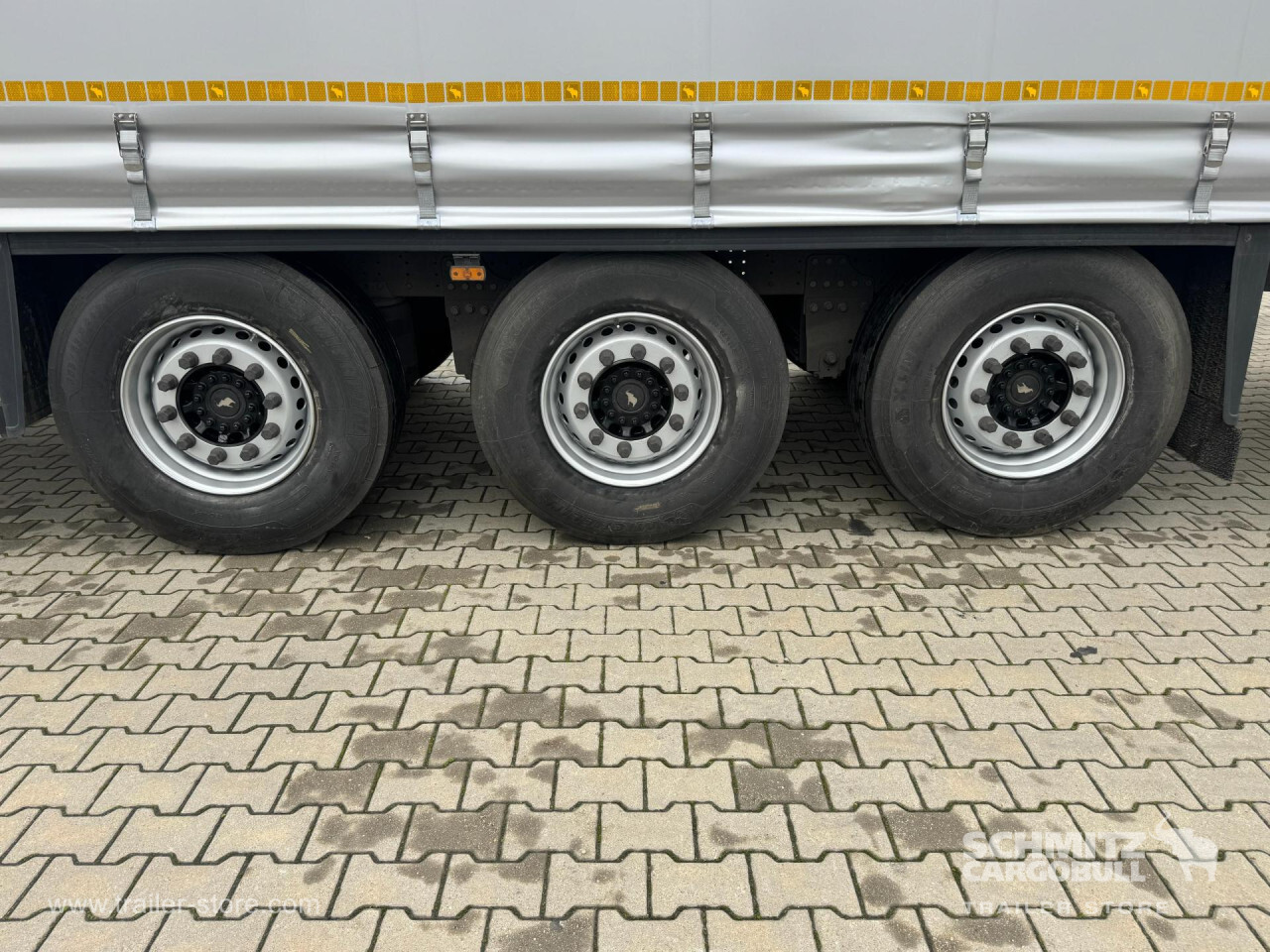 Remarks: **Safety**\\Rear underrun, Antilock Braking System ABS\\\\**Exterior**\\Air suspension, 1x15 and 2x7 pin plug, Antispray\\\\**Cargo securing**\\DIN EN 12642 (code XL) certificate\\\\**Brake system**\\Disc brake, Schmitz Cargobull\\\\**Floor**\\Wisadeck floor\\\\**Loading area**\\Length 13.620 mm, Width 2.480 mm, Height 2.780 mm, Volume 93 m³\\\\**Tyre sizes**\\1. Achse: 385/65 R22.5 , Tread depth: 11 mm / 11 mm, 2. Achse: 385/65 R22.5 , Tread depth: 11 mm / 11 mm, 3. Achse: 385/65 R22.5 , Tread depth: 11 mm / 11 mm\\\\**Other dimensions and weights**\\Wheel base: 7.700 mm\\\\----