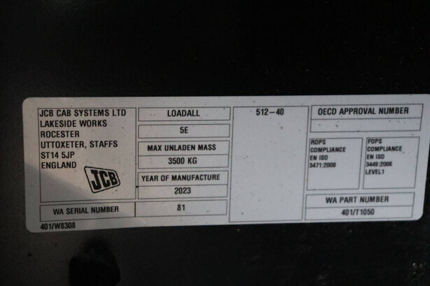 Brand: JCB Type: 512-40 Serial number: 401/W8308 Year of construction: 2023 Fuel: Diesel Engine power: Not known kW Engine Brand: Perkins Lifting capacity: 2000 kg Lifting height: 4000 mm Operating hours read: 544 h Machine weight: 3500 kg Tires: Pneumatic tires Color: yellow