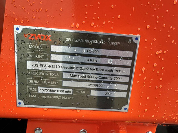Brand: ZVOX Type: TC500 Serial number: JM2508020 Year of construction: 2025 Fuel: Gasoline Engine: OHV ENGINE 212cc Load capacity: 500 kg Machine weight: 398 kg Transport dimensions (L x W x H): 1570x880x1300 mm Running gear: Tracks Tracks: 180 mm Color: red