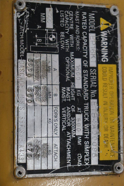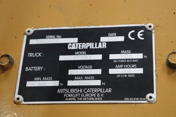 Brand: Caterpillar Type: EP16KT Serial number: ETB4A00998 Year of construction: 1998 Fuel: Electric Mast type: Duplex Sideshift: Yes Lifting capacity: 1600 kg Operating hours read: Not known Machine weight: 2310 kg Tires: Solid tires Color: yellow