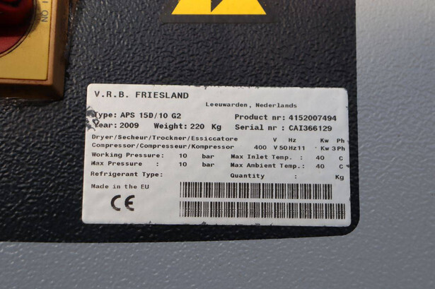 Brand: Airpress Type: APS 15D/10 G2 Serial number: CAI366129 Year of construction: 2009 Fuel: Electric Engine power: 11.0 kW Pressure: 10 Bar Color: blue