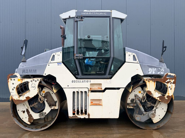 The HAMM DV90 VO is a robust and efficient vibrating roller, powered by a Deutz TCD L04 engine with 74.9 kW of power. This model features a 1.66m drum width and is equipped with both EPA and CE certifications. The machine includes an EROPS cabin, a reliable water sprinkler system, and capabilities for both drum vibration and oscillation compaction. It offers adjustable compaction frequency, a split drum, a cutting edge, and a moveable seat. Safety and convenience features include a backup alarm, beacon, frequency and speed meters, an AM/FM radio, and a high-quality backup alarm system. Operating hours are genuine with 6101 hours recorded. This 2009 machine maintains good and clean condition, weighing in at 9,410 kg with dimensions of 4.09m x 1.81m x 3.00m.