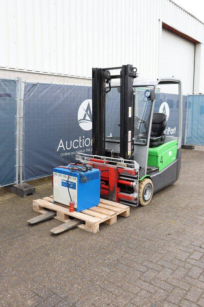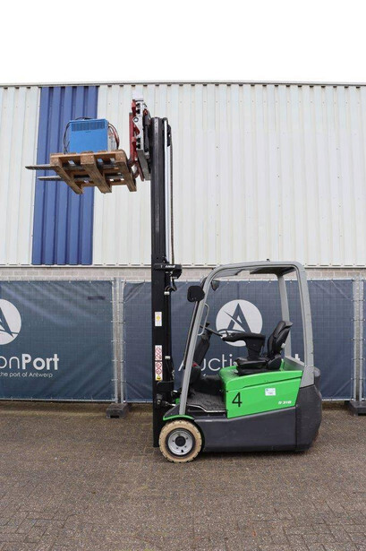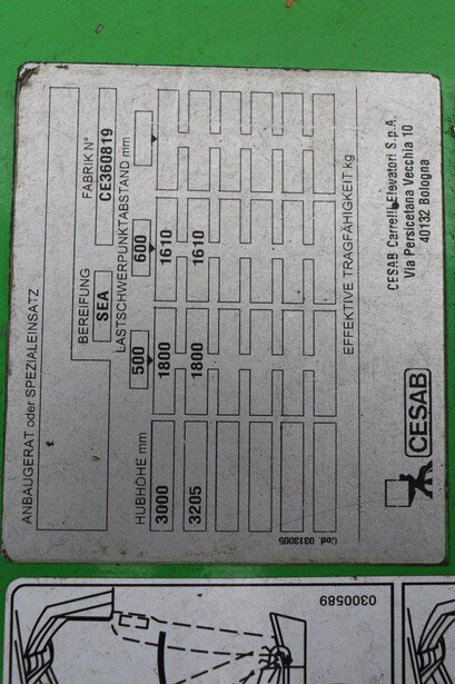 Brand: CESAB Type: B318 Serial number: CE360819 Year of construction: 2011 Fuel: Electric Mast type: Triplex Sideshift: Yes Lifting capacity: 1800 kg Lifting height: 3000 mm Operating hours read: 7834.0 h Machine weight: 3500 kg Tires: Non-marking tires Color: green