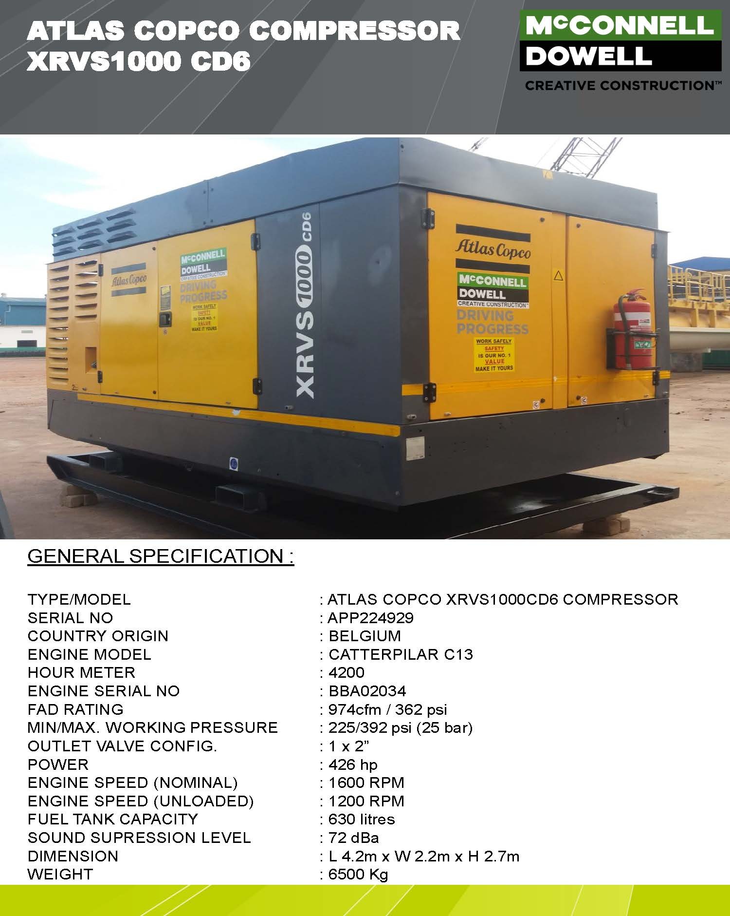 This is 1000 Cfm High Pressure (392 Psi) Atlas Copco Compressor is currently available for sale in our THAILAND yard. Good Running condition.