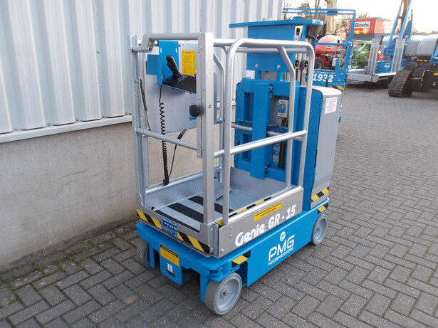 Brand: Genie Model: GR-15 Type: mast lift Serial number: GR12-23094 Year of construction: 2012 Operating hours read: 390h Fuel: electric Working height: 6.50m Lifting capacity: 227kg Machine weight: 988kg Wheels: non-marking tires Drive: 24V