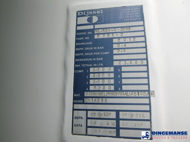 Dijssel aluminium fuel tank, Capacity 23600 liters, 4 Compartments (6800;3500;6100;7200), Year of construction 2012, Test pressure 0.40 bar, Tank material code 14286, Hose reel, Hydraulic discharge pump, Counter, Vapour recovery, Overload sensor // Truck 6x2, Euro 5, Adblue,Automatic gearbox, Diff lock, Full air suspension, 3rd axle lift and steering axle, Alloy wheels, Sleep cabin, 1 bed, Night heater, Airconditioning, Digital tachograph, Shipment dimensions 880x240x340 cm