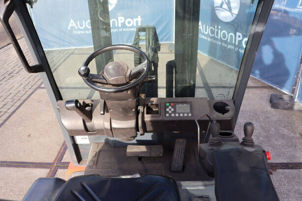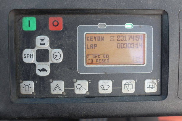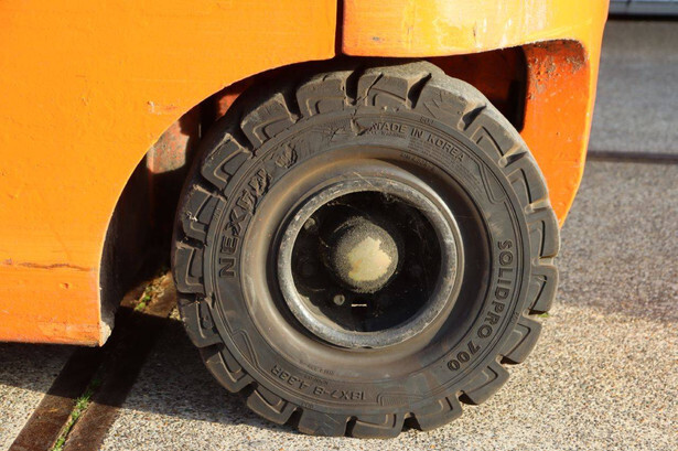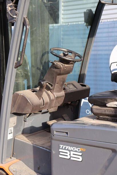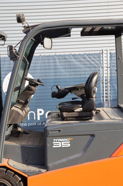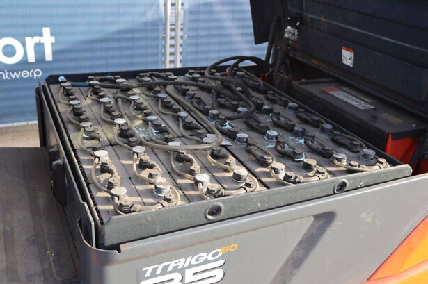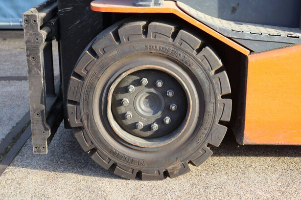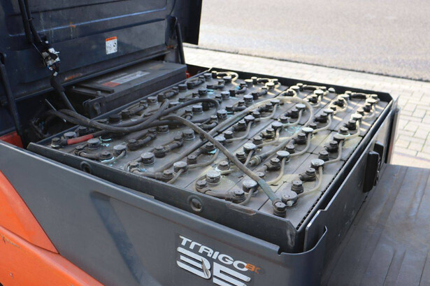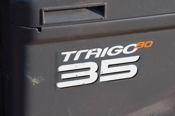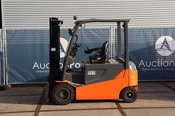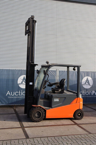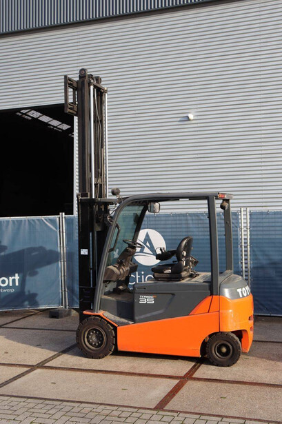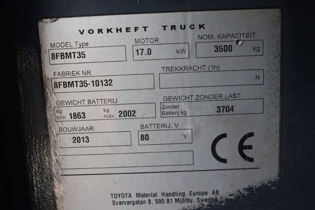 Brand: Toyota Type: 8FBMT35 Serial number: 8FBMT35-10132 Year of construction: 2013 Fuel: Electric Mast type: Duplex Sideshift: No Lifting capacity: 3500 kg Operating hours read: 23174 h Machine weight: 5706 kg Tires: Solid tires Color: orange