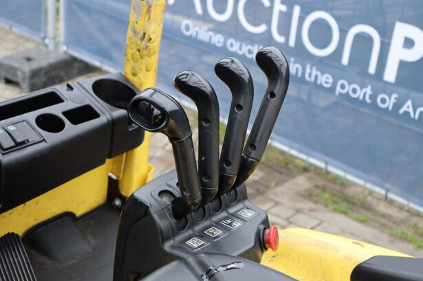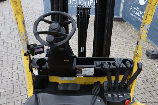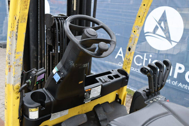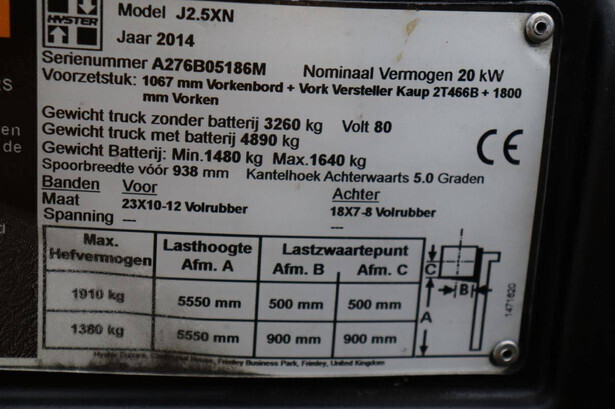 Brand: Hyster Type: J2.5XN Serial number: A276B05186M Year of construction: 2014 Fuel: Electric Mast type: Triplex Sideshift: Yes Lifting capacity: 1910 kg Lifting height: 6000 mm Operating hours read: 20185 h Machine weight: 4890 kg Tires: Solid tires Color: yellow