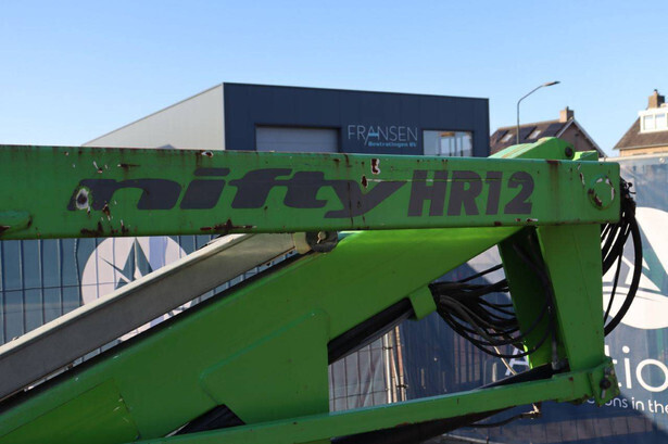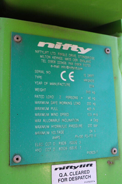 Brand: Niftylift Type: HR12NDE Serial number: 12 28677 Year of construction: 2014 Fuel: Electric + Diesel Lifting capacity: 240 kg Working height: 12 m Operating hours read: Not known Machine weight: 3110 kg Chassis: Wheels Type: Articulated boom lift Tires: Pneumatic tires Color: green