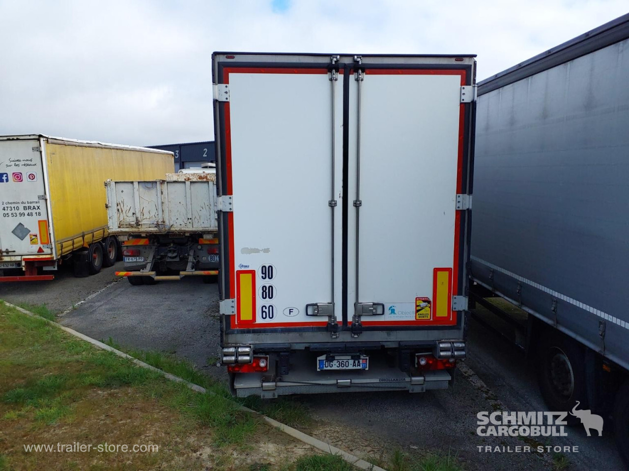 Remarks: **Safety**\\Rear underrun, Antilock Braking System ABS, Fire extinguisher holder, Hubodometer, Telematics system\\\\**Interior**\\Temperature recorder\\\\**Exterior**\\Air suspension, Lift axle front and rear, Taillift: Dhollandia, Spare wheel carrier double, Bolted chassis, Gantry doors, 1x15 and 2x7 pin plug, Antispray, International customs seals\\\\**Cargo securing**\\Load securing rail\\\\**Brake system**\\Disc brake, Schmitz ROTOS\\\\**Floor**\\Aluminum floor\\\\**Wand**\\Stirnwand verstärkt\\\\**Wall**\\Frontwall recess for cooling\\\\**Cooling unit**\\Thermoking SLX E 200, Diesel/Elektro\\\\**Loading area**\\Length 13.410 mm, Width 2.460 mm, Height 2.650 mm, Volume 87 m³\\\\**Tyre sizes**\\1. Achse: 385/65 R22.5 , Tread depth: 17 mm / 17 mm, 2. Achse: 385/65 R22.5 , Tread depth: 17 mm / 17 mm, 3. Achse: 385/65 R22.5 , Tread depth: 17 mm / 17 mm\\\\**Other dimensions and weights**\\Payload: 28.765 kg, GVW: 38.000 kg\\\\----Disques de frein Essieu 1 reste 43mm Plaquettes usure 50% Disques de frein Essieu 2 reste 43mm Plaquettes usure 50% Disques de frein Essieu 3 reste 43mm Plaquettes usure 40% Mines : 12/2026 - FRC : 04/2026 -