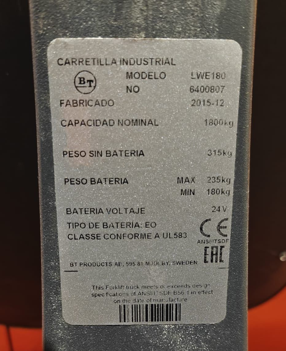 BT LWE 180 Load capacity: 1.800 Kg Lifting height: Mast: Fork: 1.150 x 550 mm Build height: Motorization: Electric Battery: 24v/225Ah Charger: 24 v In working condition, Battery condition 78%. Reference number: 7534