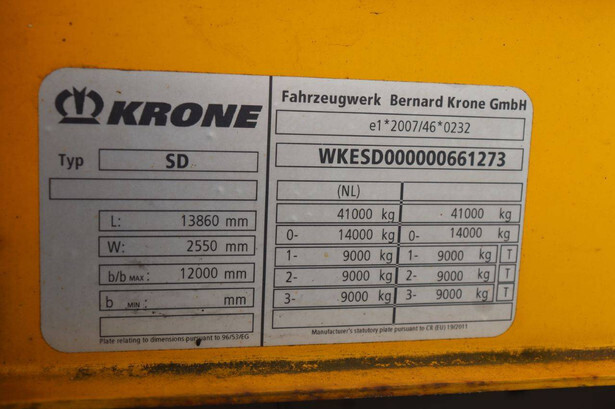Brand: Krone Type: SD Chassis number: WKESD000000661273 Year of construction: 2015 MTM: 41000 kg Number of axles: 3