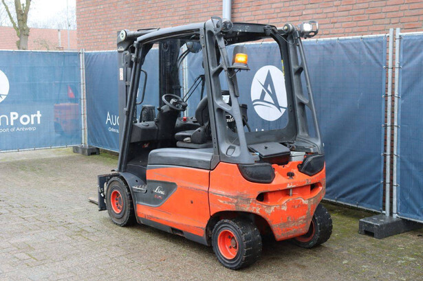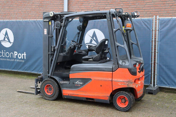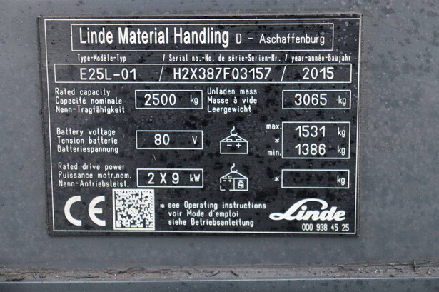 Brand: Linde Type: E25L-01 Serial number: H2X387F03157 Year of construction: 2015 Fuel: Electric Mast type: Triplex Sideshift: No Lifting capacity: 2500 kg Operating hours read: 4823 h Machine weight: 4596 kg Tires: Solid tires Color: red