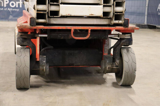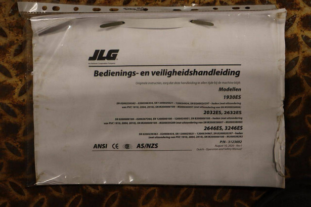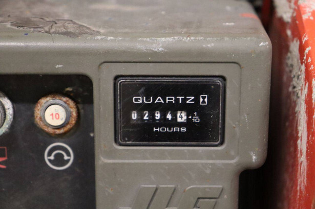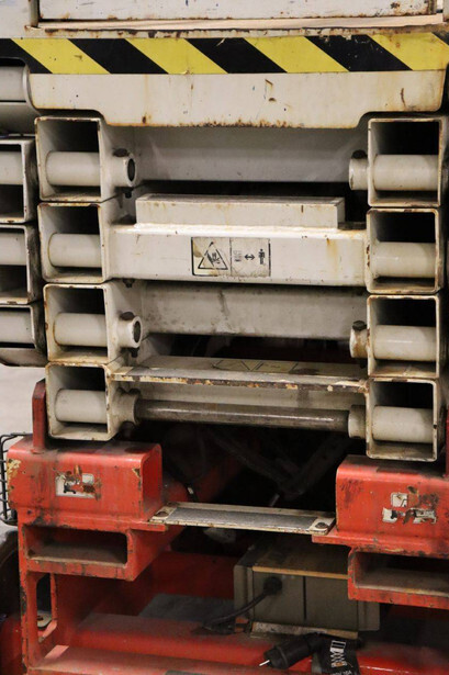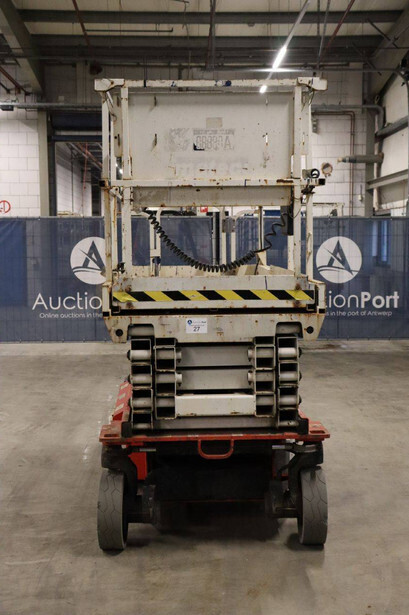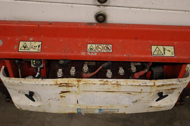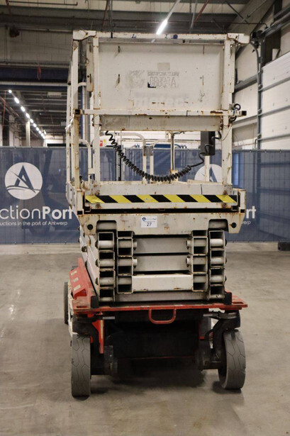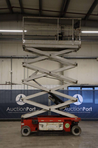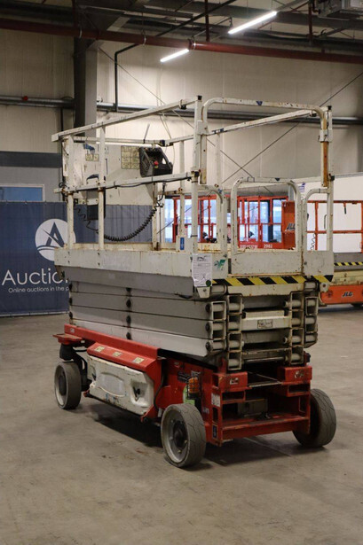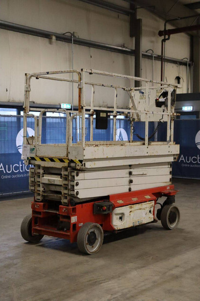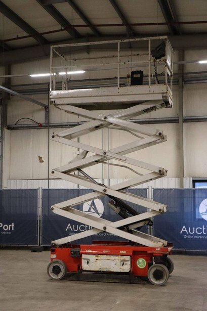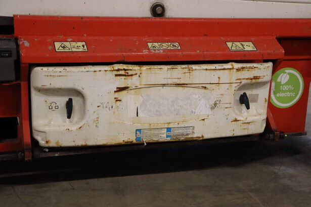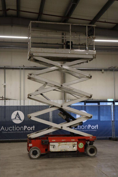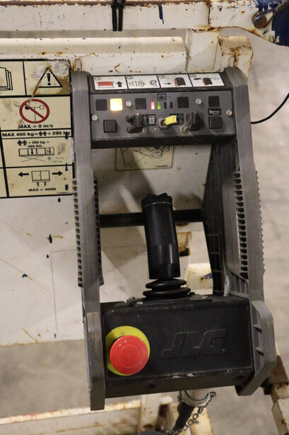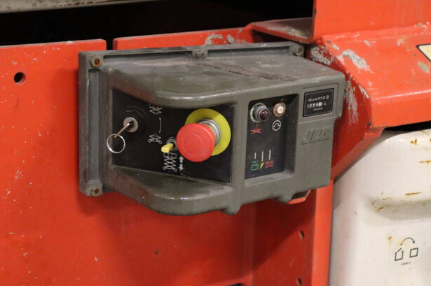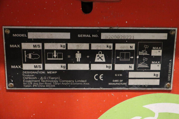 Brand: JLG Type: 2646ES Serial number: B200028221 Year of construction: 2016 Fuel: Electric Lifting capacity: 450 kg Working height: 9.92 m Operating hours read: 294 h Machine weight: 2560 kg Chassis: Wheels Type: Scissor lift Tires: Non-marking tires Color: red