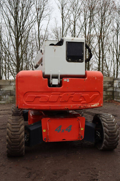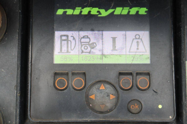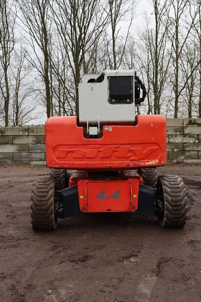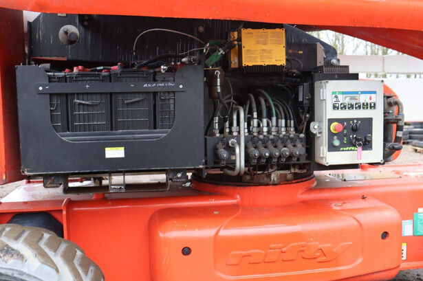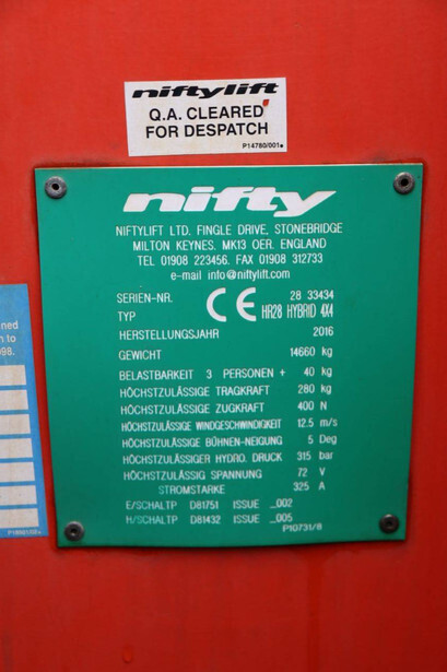 Brand: Nifty Type: HR28 Hybrid 4x4 Serial number: 2833434 Year of construction: 2016 Fuel: Electric + Diesel Lifting capacity: 280 kg Working height: 28 m Reading operating hours: 1623 h Machine weight: 14660 kg Chassis: Wheels Type: Telescopic boom lift Tires: Solid tires Color: orange