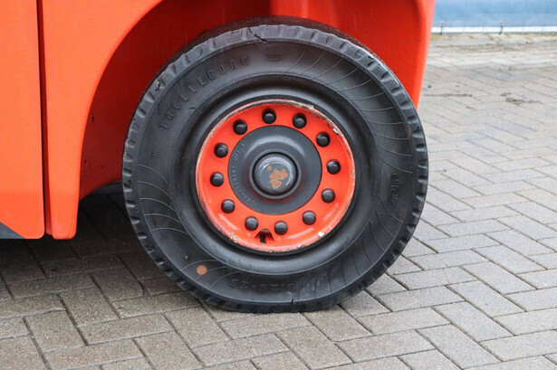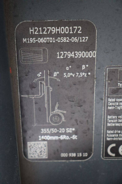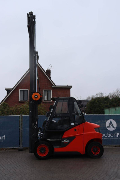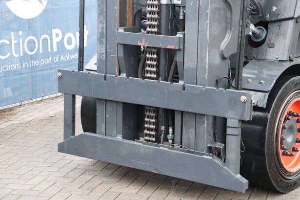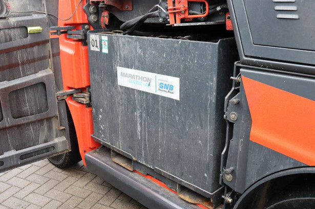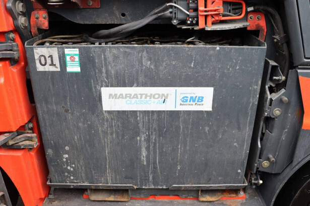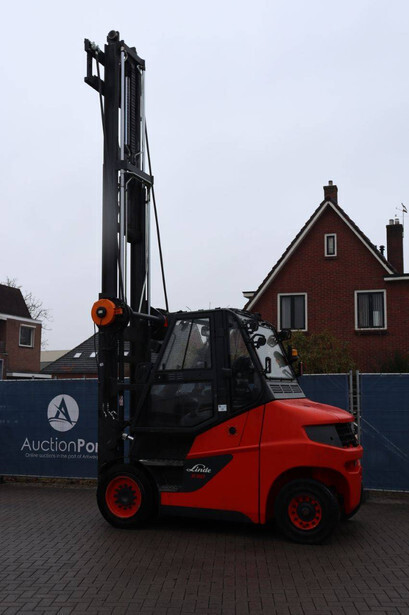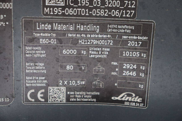 Brand: Linde Type: E60-01 Serial number: H21279H00172 Year of construction: 2017 Fuel: Electric Mast type: Triplex Sideshift: No Lifting capacity: 6000 kg Lifting height: 7500 mm Operating hours read: 10393 h Machine weight: 13029 kg Tires: Solid tires Color: orange