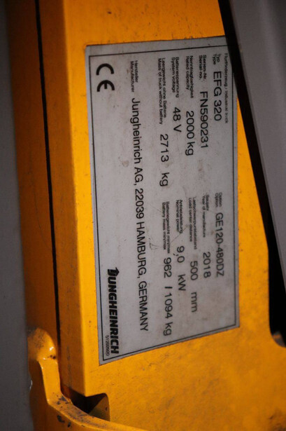 Brand: Jungheinrich Type: EFG 320 Serial number: FN590231 Year of construction: 2018 Fuel: Electric Mast type: Not known Sideshift: Yes Lifting capacity: 2000 kg Lifting height: 4800 mm Operating hours read: Not known Machine weight: 3810 kg Tires: Solid tires Color: yellow