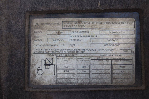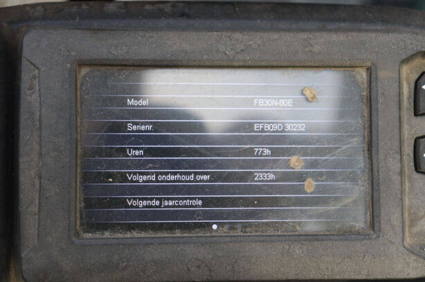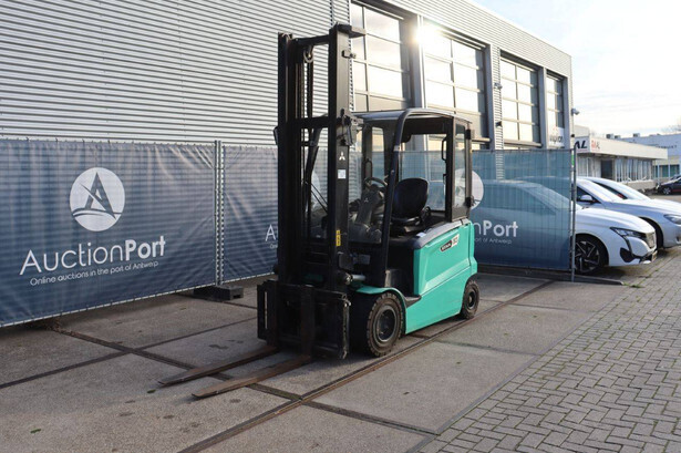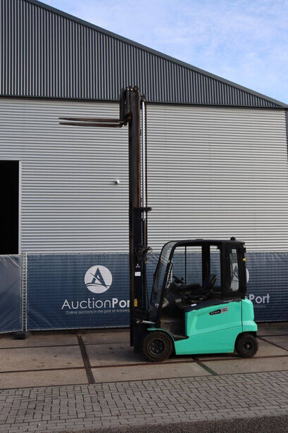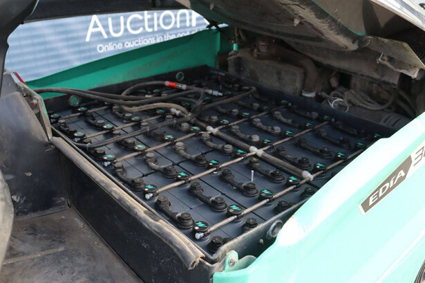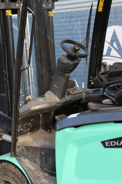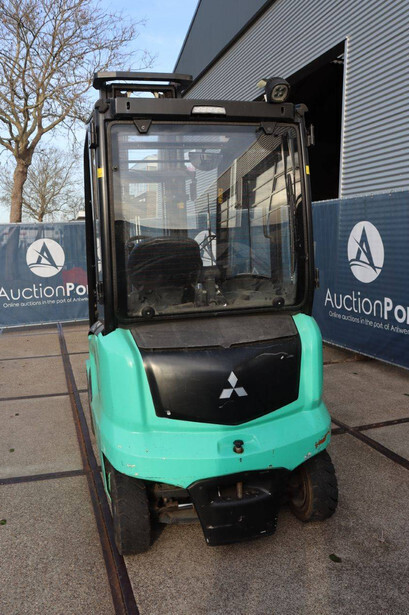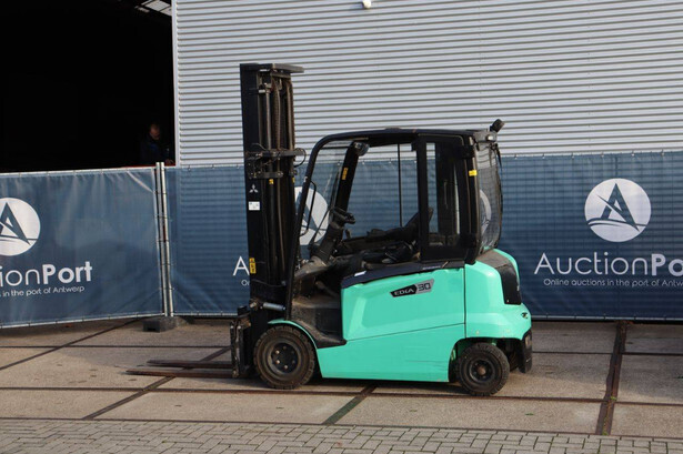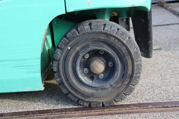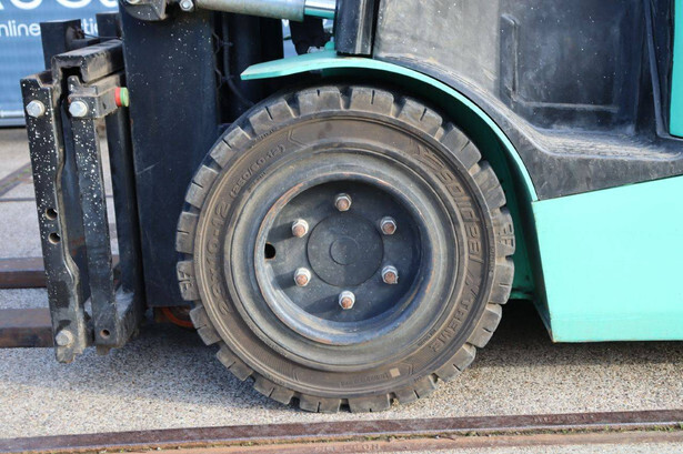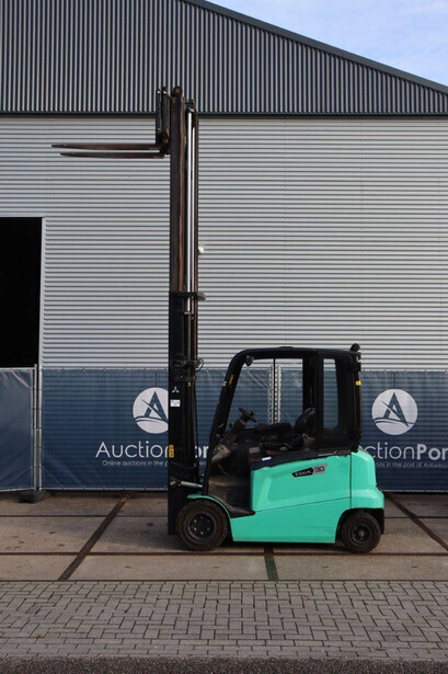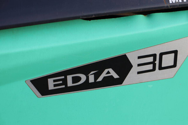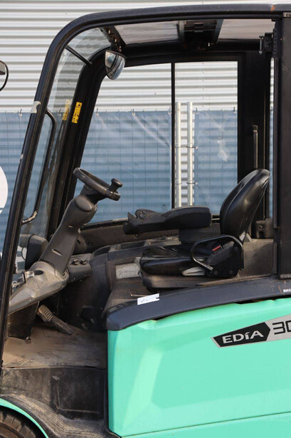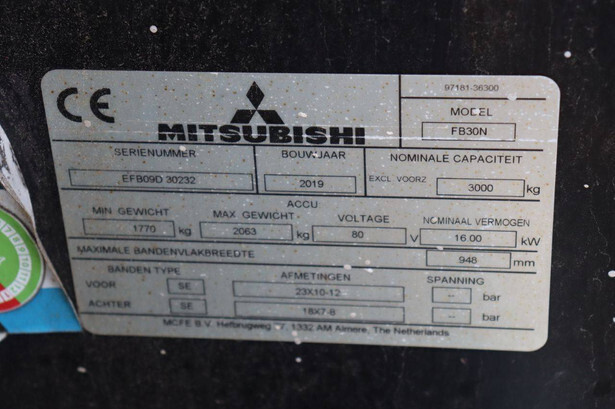 Brand: Mitsubishi Type: FB30N Serial number: EFB09D 30232 Year of construction: 2019 Fuel: Electric Mast type: Duplex Sideshift: Yes Lifting capacity: 3000 kg Lifting height: 4500 mm Operating hours read: 773 h Machine weight: 5653 kg Tires: Solid tires Color: green